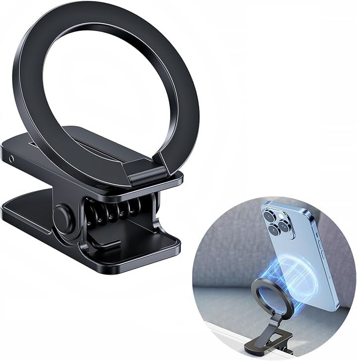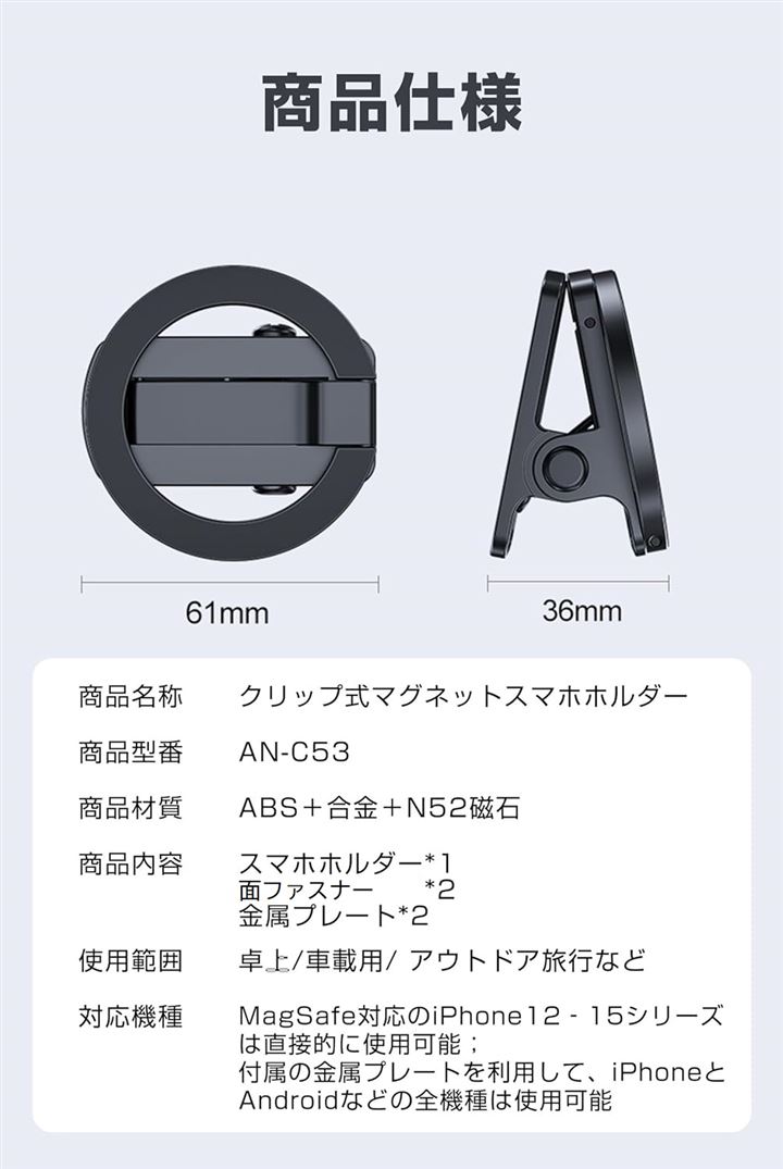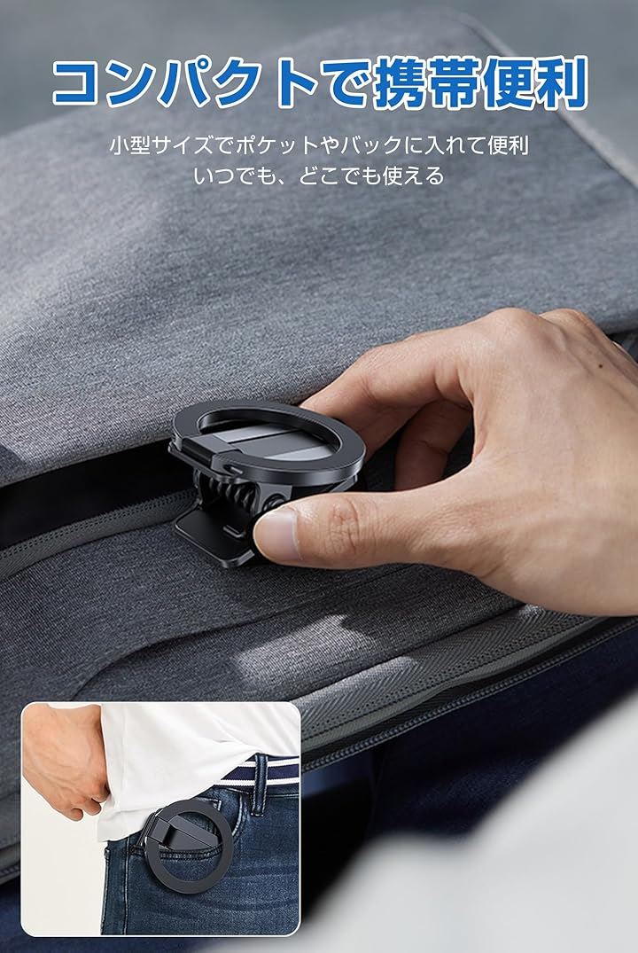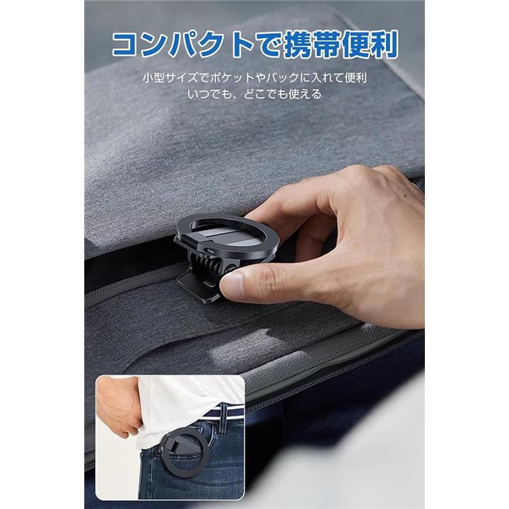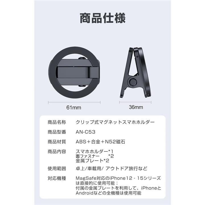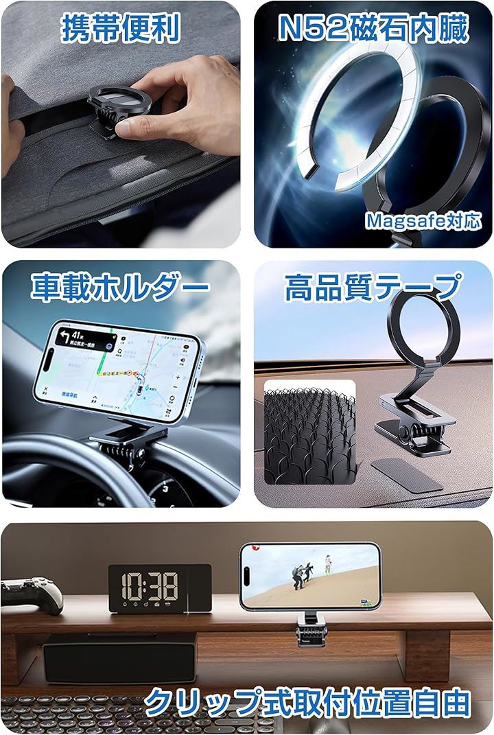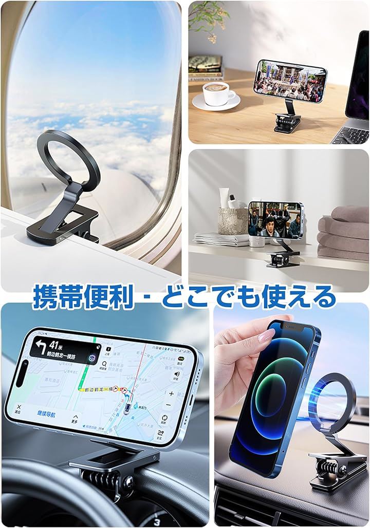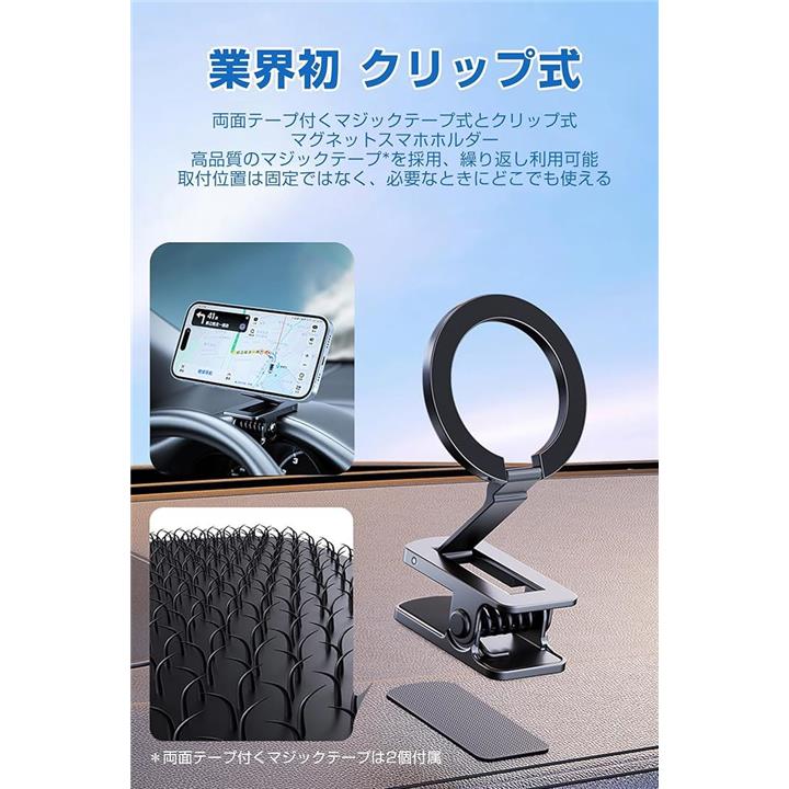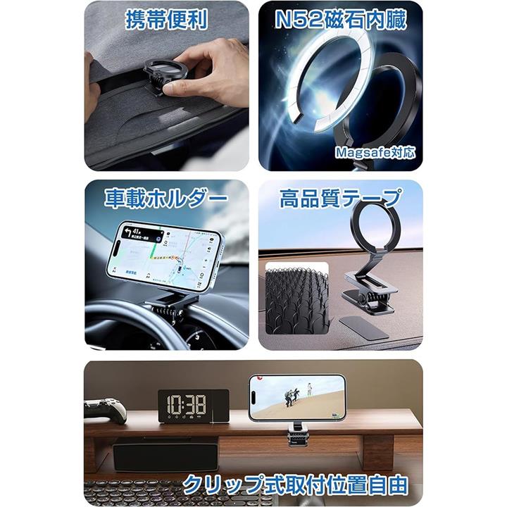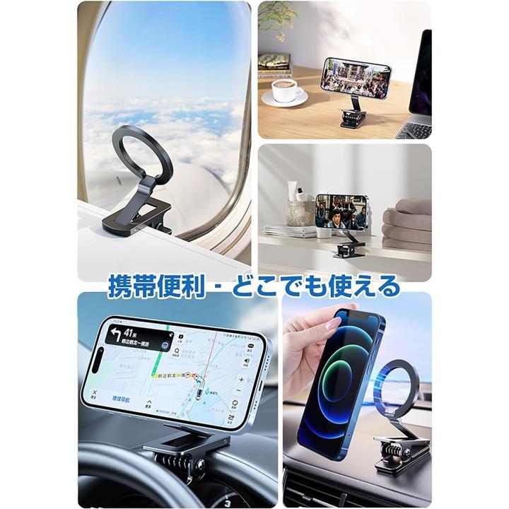 マグネットスマホホルダー クリップ式 MagSafe対応 面ファスナー付き スマホスタンド 折り畳める 車載ホルダー 二関節調整 携帯スタンド 卓上用 車載用 旅行用 携帯便利