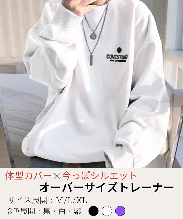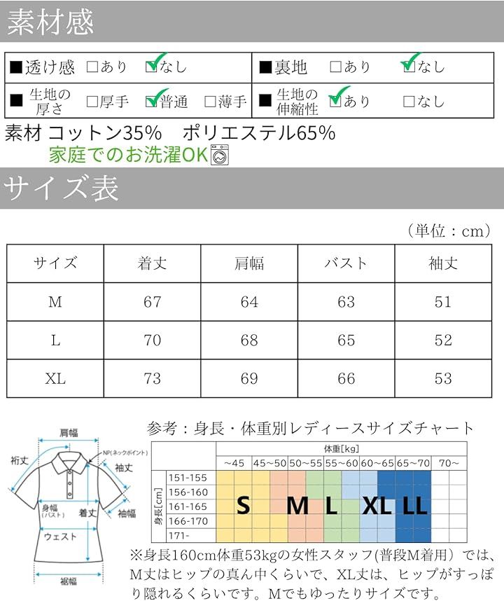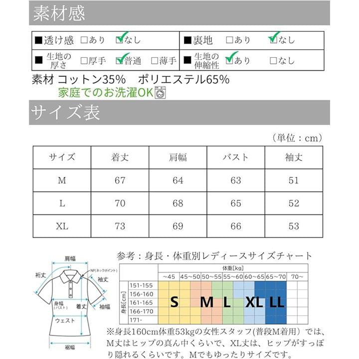 「素材」コットン35% ポリエステル65% 「カラー」白、黒、紫「サイズ(cm)」M 着丈67/肩幅64/バスト63/袖丈51 L 着丈70/肩幅68/バスト65/袖丈52 XL 着丈73/肩幅69/バスト66/袖丈53