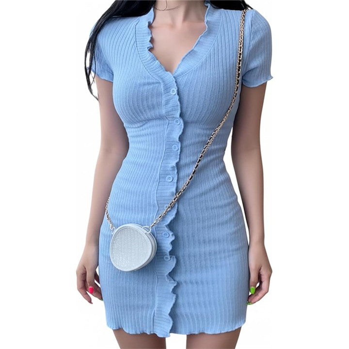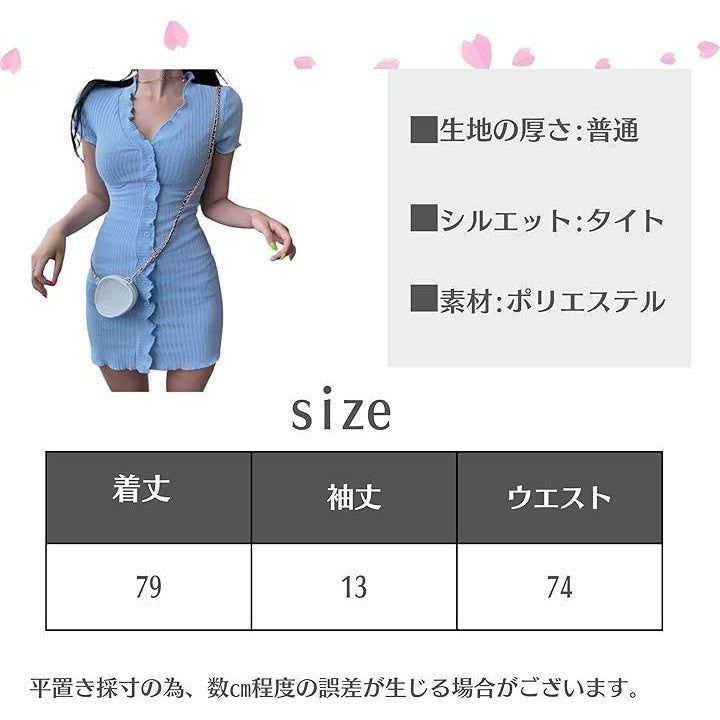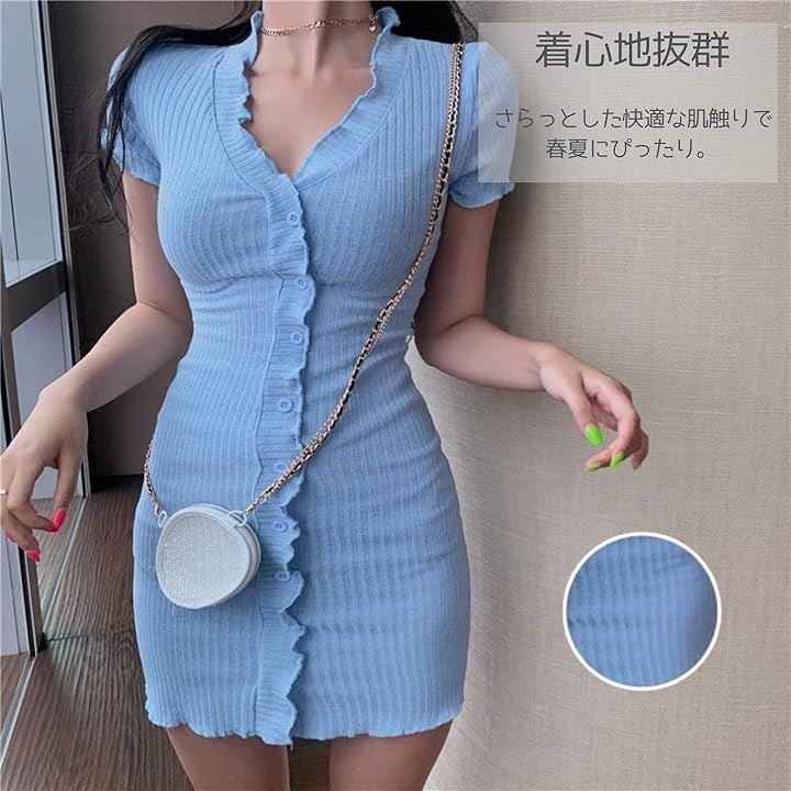 Vネック マイクロワンピース タイト レディース 半袖 薄手 ニット 足見せ フロントボタン