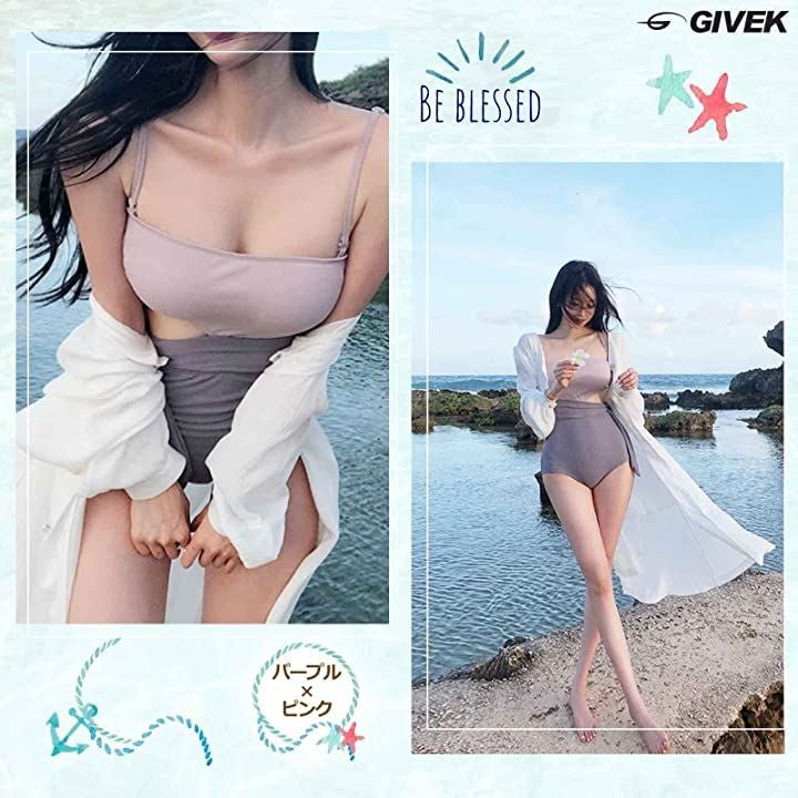 「GIVEK」水着 レディース ワンピース セクシー 可愛い ハイウエスト 上下セット インナー付き(M, パープルxピンク) |