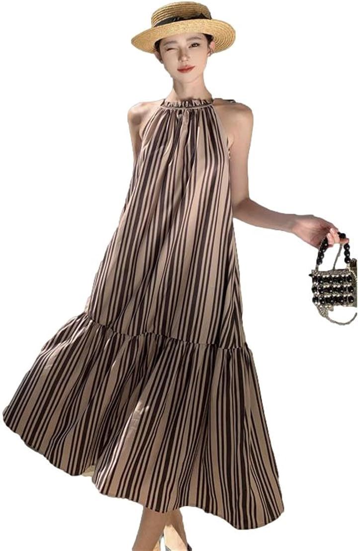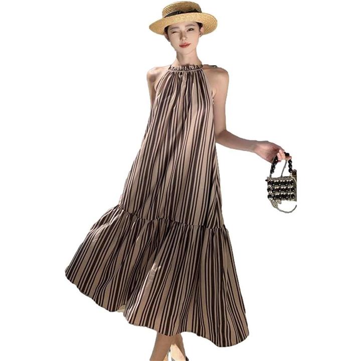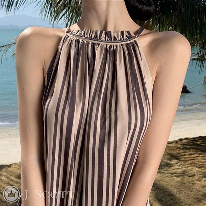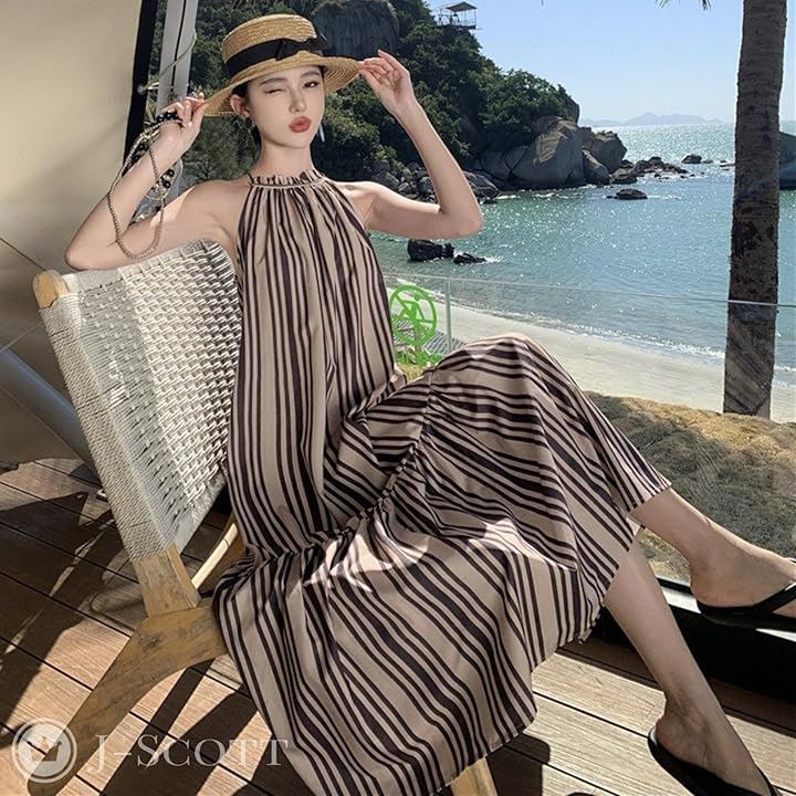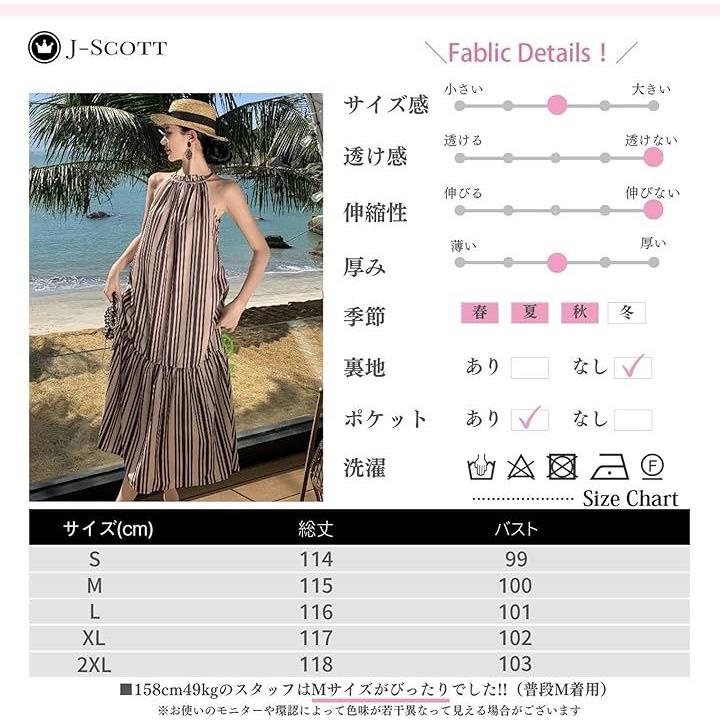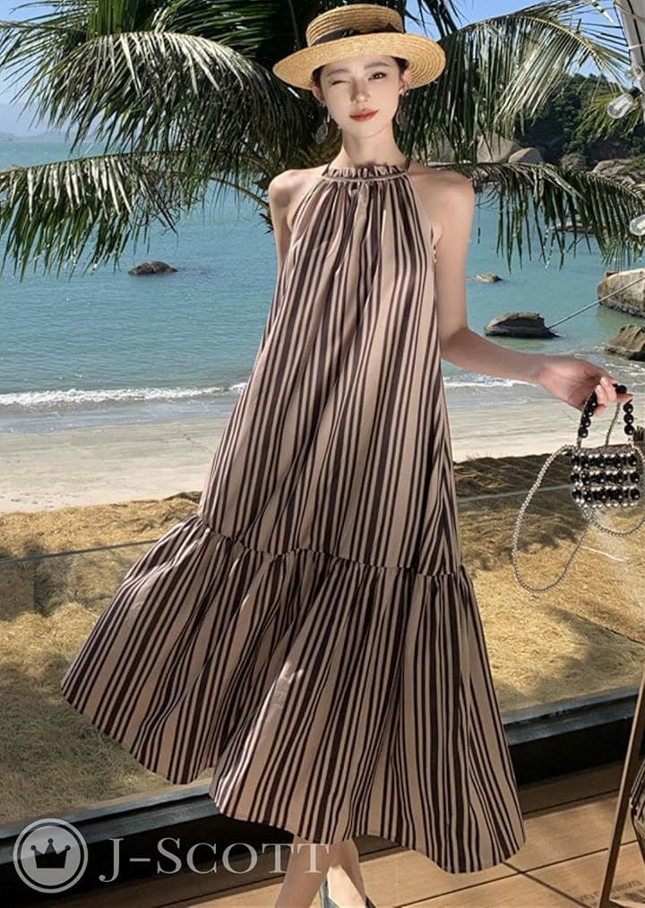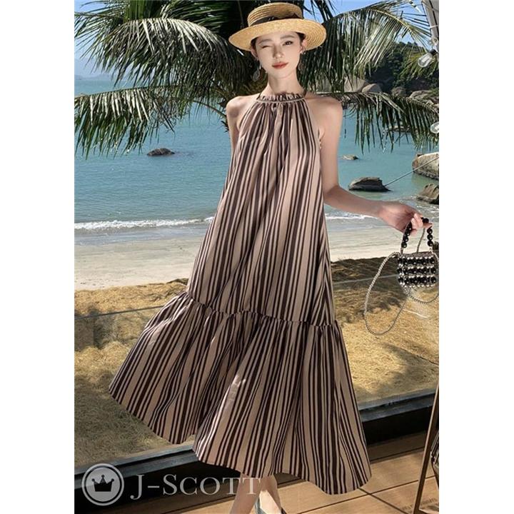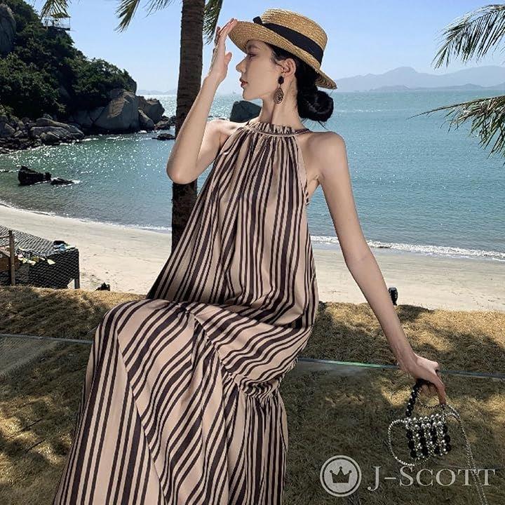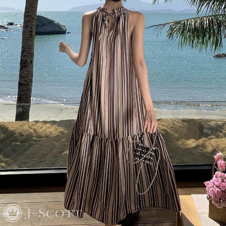 ワンピース レディース ロング リゾート Aライン ストライプ モノトーン アメスリ フリル JS141