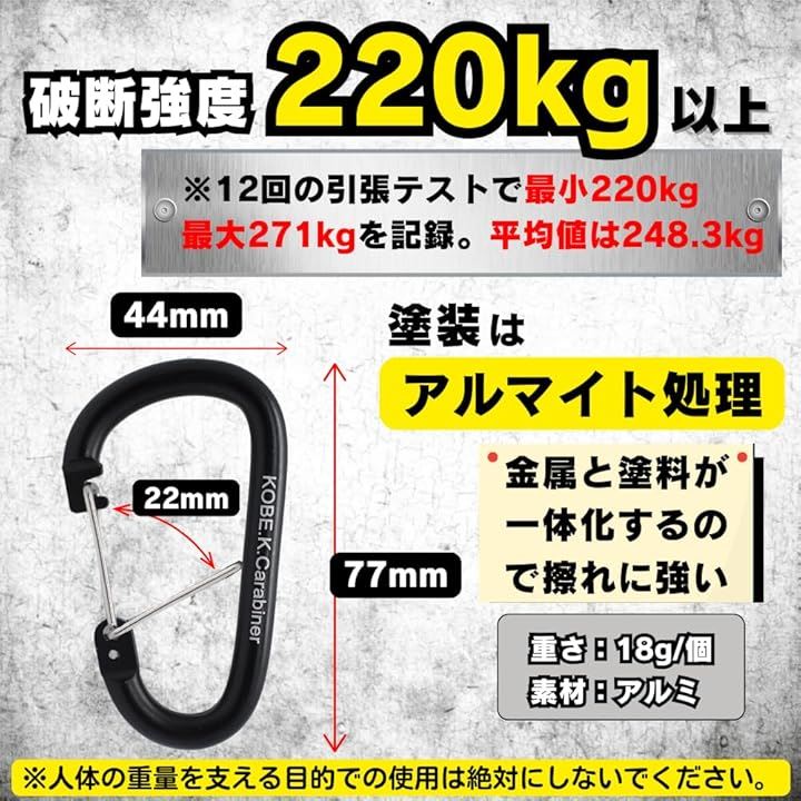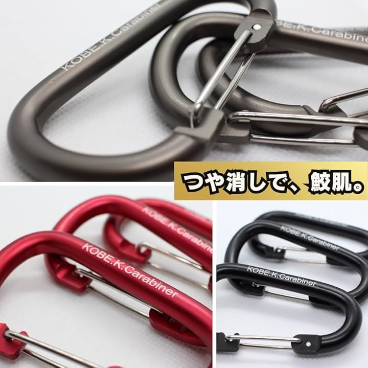 商品仕様(スペック) 入個数:3個入り サイズ:約7.5cm x 4.5cm 厚み:約6mm 重量:約18g 材質:高品質アルミ合金 仕上げ:耐久性のある塗装 形状:D型デザイン ゲートタイプ:スプリング式ワイヤーゲート(片手で簡単開閉) カラー:つや消し仕様(ブラック レッド グレー 3色展開) 耐荷重(参考値):約220kg以上(*クライミングや命綱には使用不可) 用途:キーホルダー アウトドア 登山 キャンプ 釣り 作業 防災 バイク 車 収納