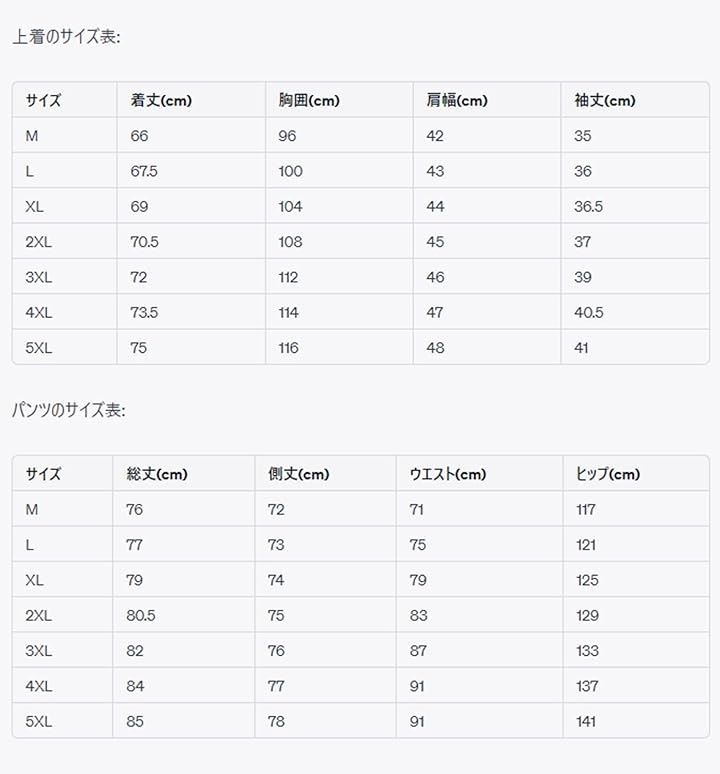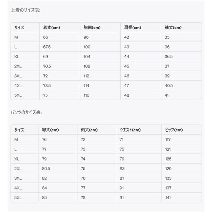 「上サイズ」 「M」着丈66 胸囲96 肩幅42 袖丈35 「L」着丈67.5 胸囲100 肩幅43 袖丈36 「XL」着丈69 胸囲104 肩幅44 袖丈36.5 「2XL」着丈70.5 胸囲108 肩幅45 袖丈37 「3XL」着丈72 胸囲112 肩幅46 袖丈39 「4XL」着丈73.5 胸囲114 肩幅47 袖丈40.5 「5XL」着丈75 胸囲116 肩幅48 袖丈41 「下サイズ」 「M」総丈76 側丈72 ウエスト71 ヒップ117 「L」総丈77 側丈73 ウエスト75 ヒップ121 「XL」総丈79 側丈74 ウエスト79 ヒップ125 「2XL」総丈80.5 側丈75 ウエスト83 ヒップ129 「3XL」総丈82 側丈76 ウエスト87 ヒップ133 「4XL」総丈84 側丈77 ウエスト91 ヒップ137 「5XL」総丈85 側丈78 ウエスト91 ヒップ141