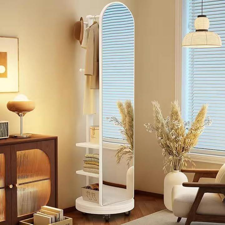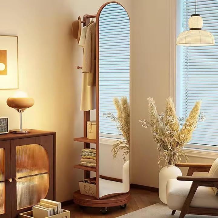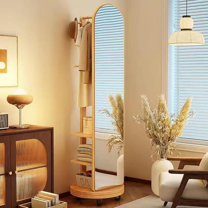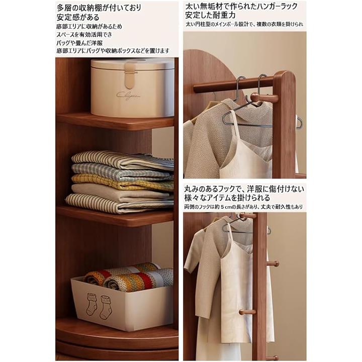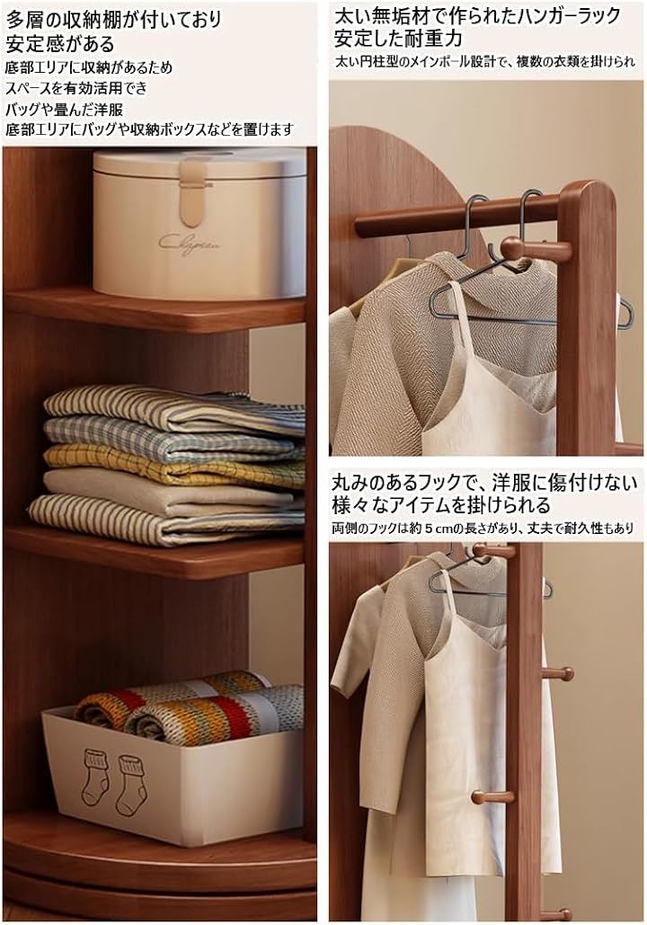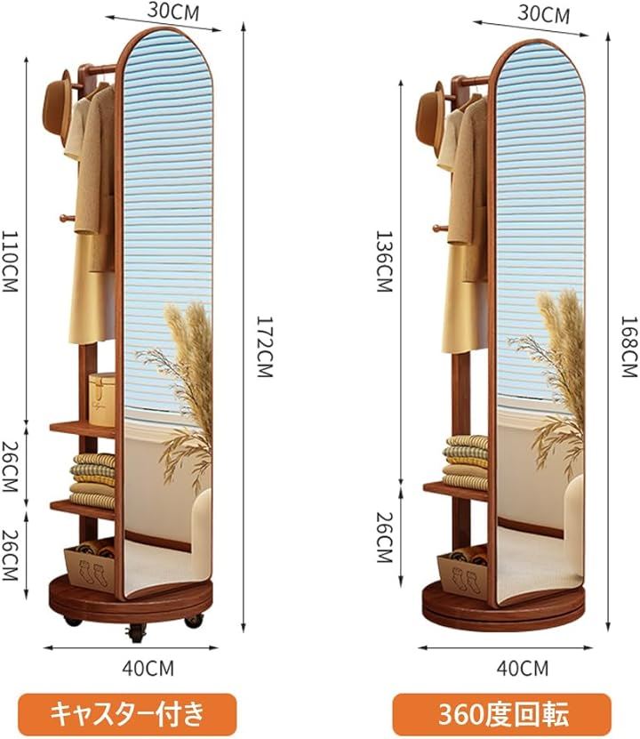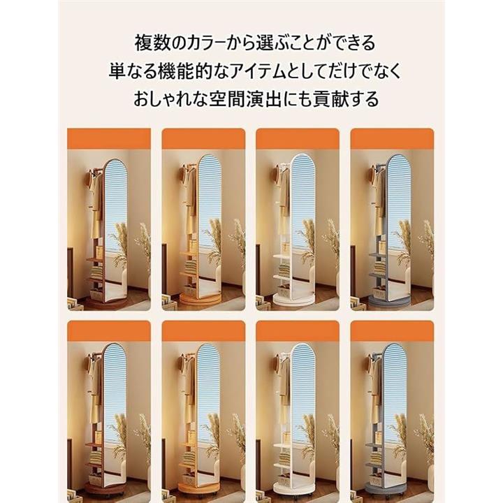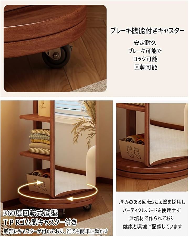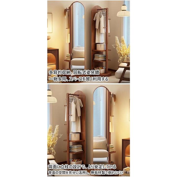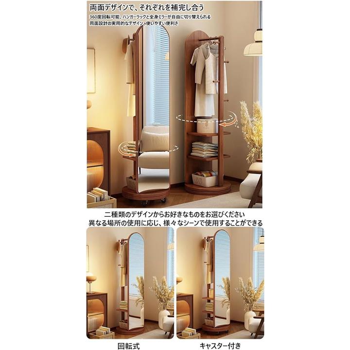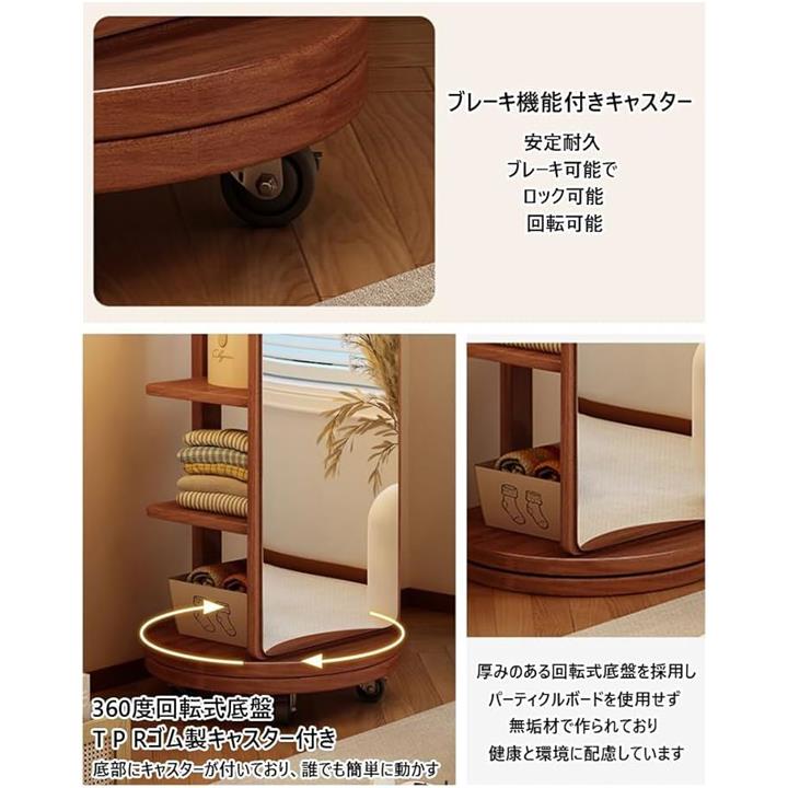 全身鏡 全身ミラー 360度回転 収納付ミラー ミラーラック 木製 木目調 ハンガーラック付き ハンガーフック付き スタンドミラー 円型姿見鏡