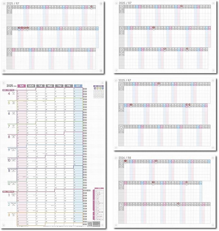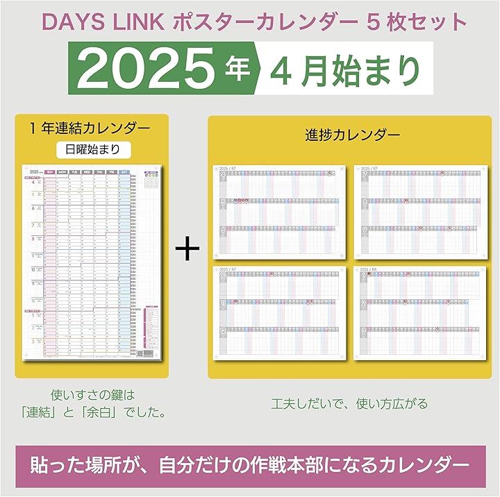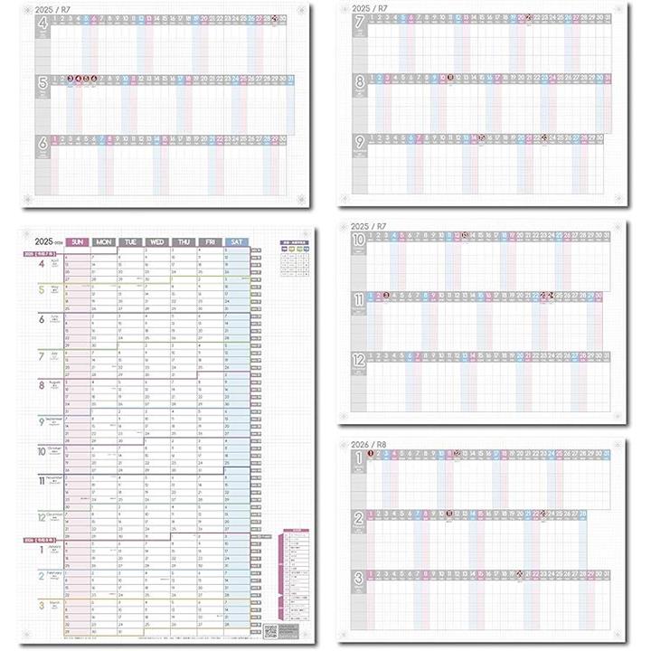 1年連結カレンダー & 進捗カレンダー ガンチャート 家族カレンダー 2025年 4月始まり日曜始まり 大きい 壁掛け A2 A3