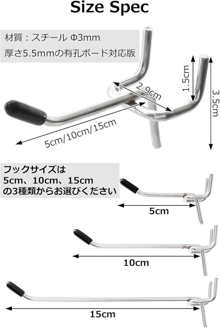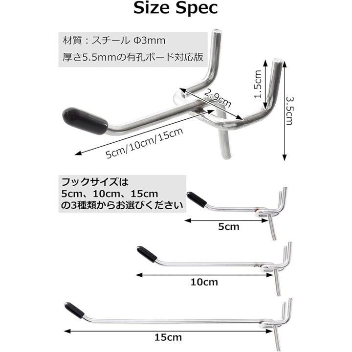 「丈夫な金属製」有孔ボード フックは直径3mmの丈夫なスチール製です。