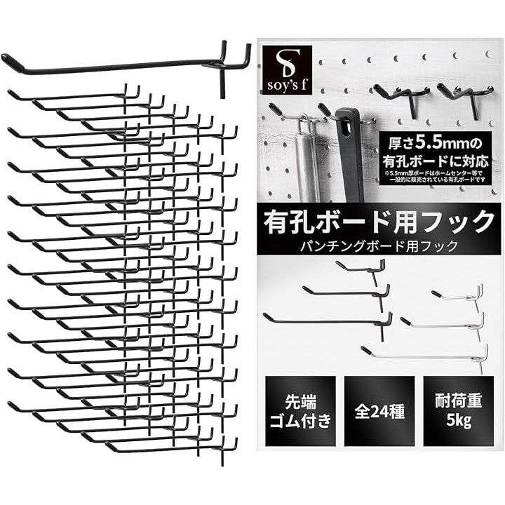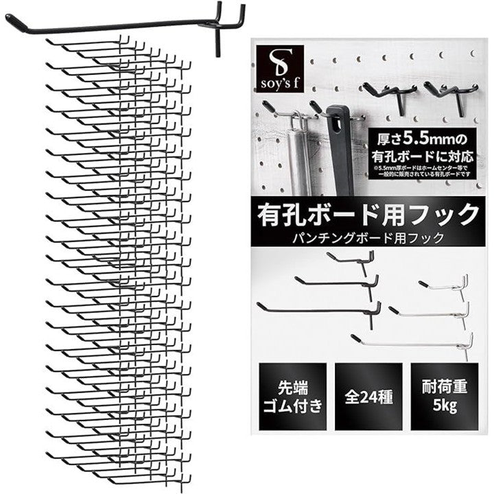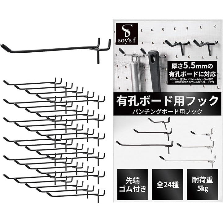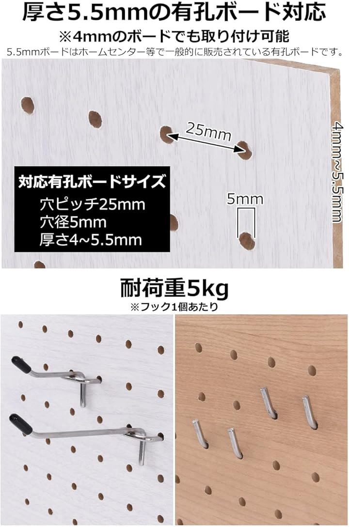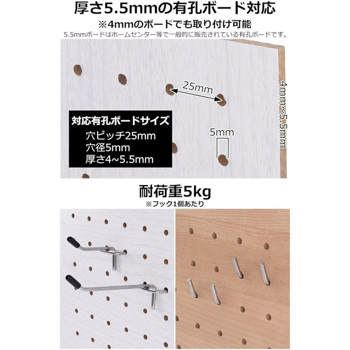「ボードの厚さ5.5mm対応版」パンチングボード用フックはホームセンター等で一般的に販売されている厚さ5.5mm、ピッチ25mmの有孔ボードに対応したフックになります。