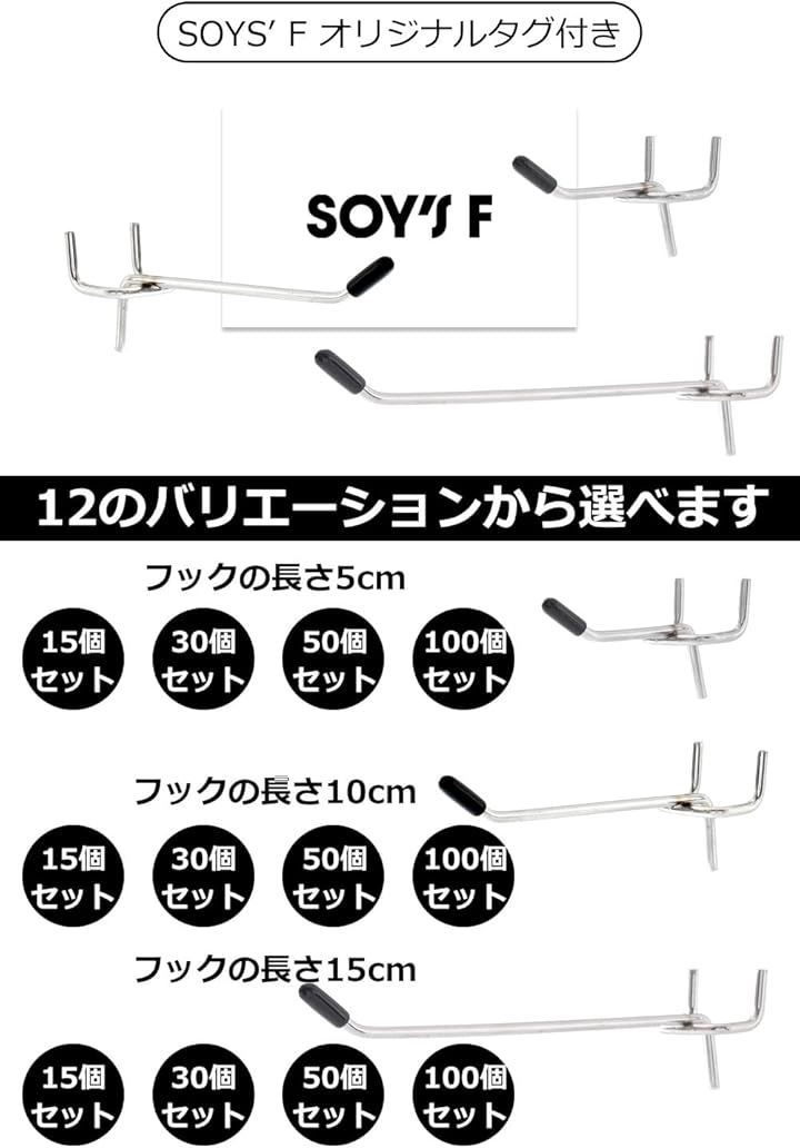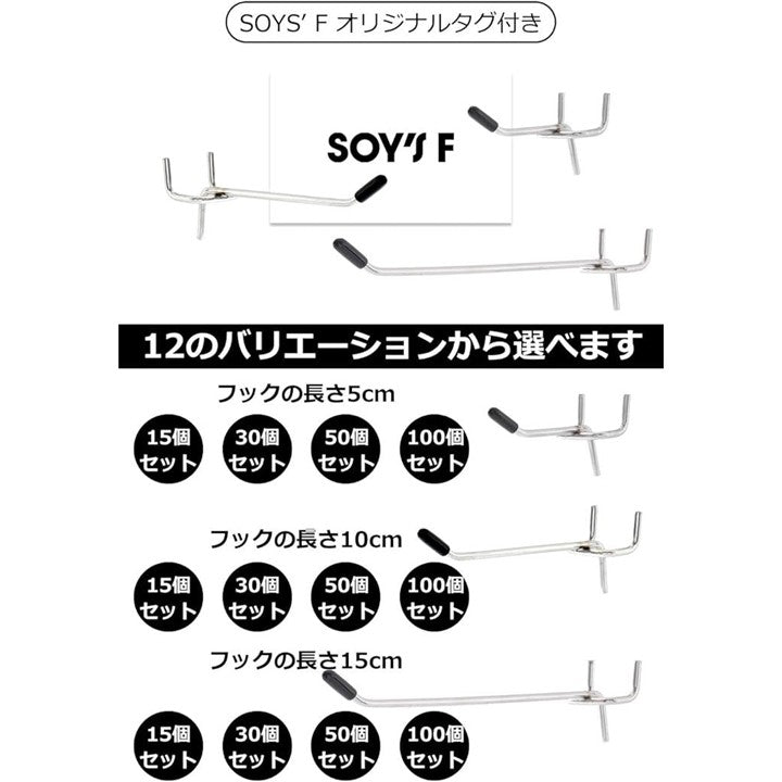 必要なサイズ・個数が選べるように、フックの長さは5cm・10cm・15cmの3サイズ、個数は15個セット・30個セット・50個セット・100個セットの4種類の計12バリエーションをご用意いたしました。