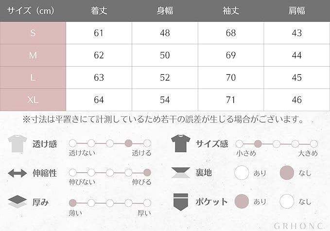「カラー」5カラー「サイズ」S~XL「素材」ポリエステル90%、スパンデックス10%「生地感」伸縮性:あり/透け感:若干あり/生地の厚さ:薄手/ポケット:あり「サイズ感」小さめ(*1サイズUPがおすすめです)