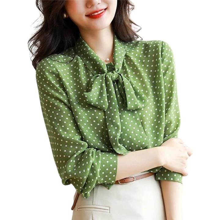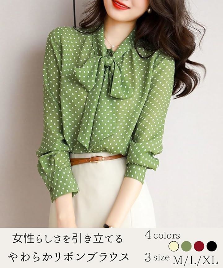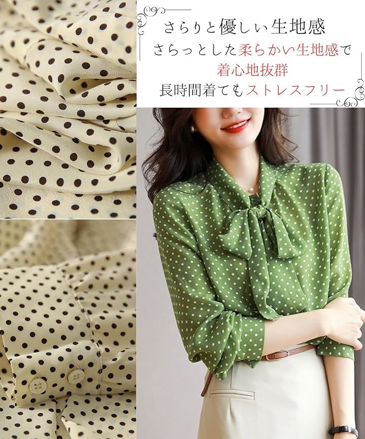「商品の特徴(2)」レトロ可愛いドット柄トップスは、緑や赤などのカラーバリエーションが揃い、選ぶ楽しさもあるボウタイブラウス。
