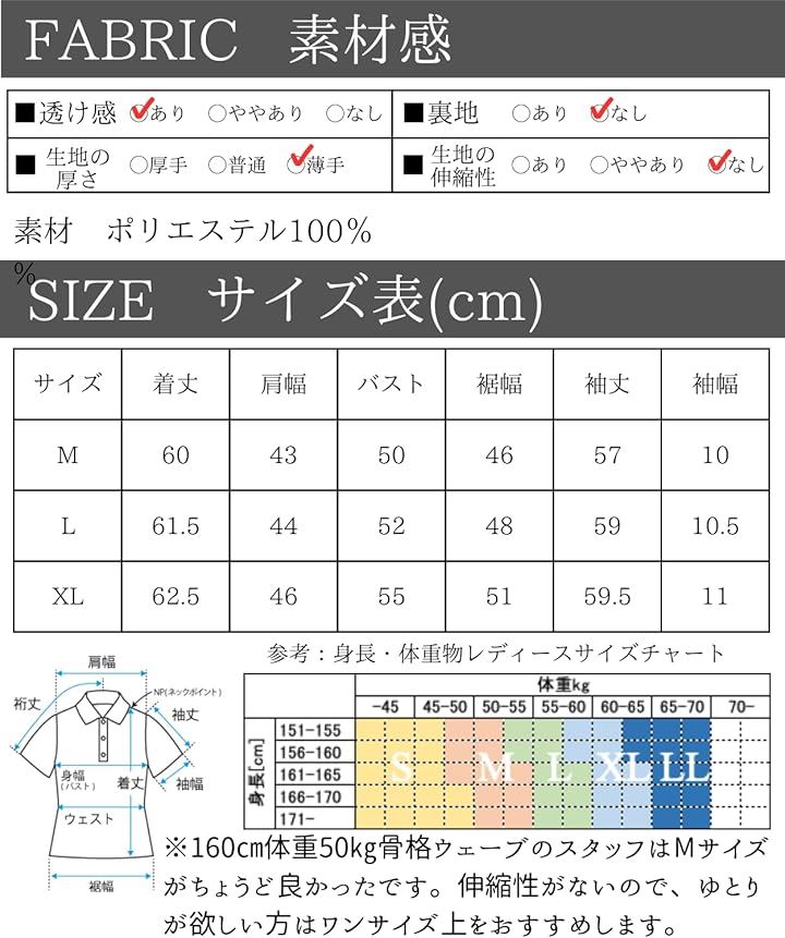 「素材」ポリエステル100% 「カラー」グリーン、レッド、ブラック、ベージュ「サイズ(cm)」M 着丈60/肩幅43/バスト50/裾幅46/袖丈57/袖幅10 L 着丈61.5/肩幅44/バスト52/裾幅48/袖丈59/袖幅10.5 XL 着丈62.5/肩幅46/バスト55/裾幅51/袖丈59.5/袖幅11