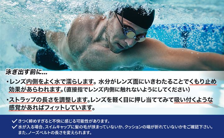 「使用時のご注意」水が入る場合は、スイムキャップに髪の毛が挟まっていないか、クッションの端が折れていないかをご確認ください。