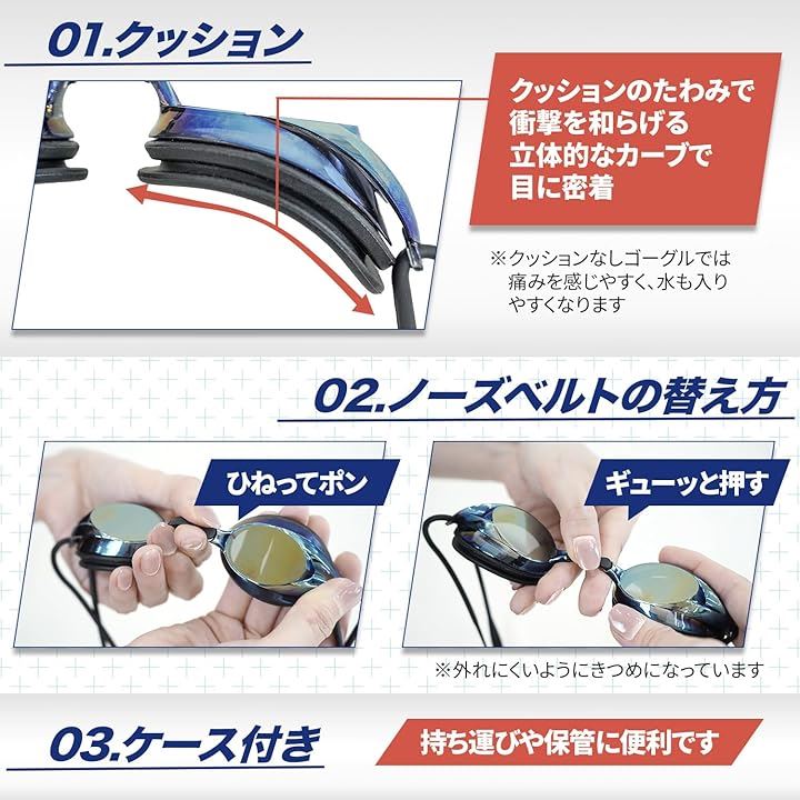 [ONE MORE LIFE] スイミングゴーグル ミラー&クリアレンズ 「フィット」 サイズ調節 ノーズベルト3種類 クッション付 フリーサイズ 大人子供 軽量 曇り止め ケース付き プールが楽しくなる 男女 水泳 |