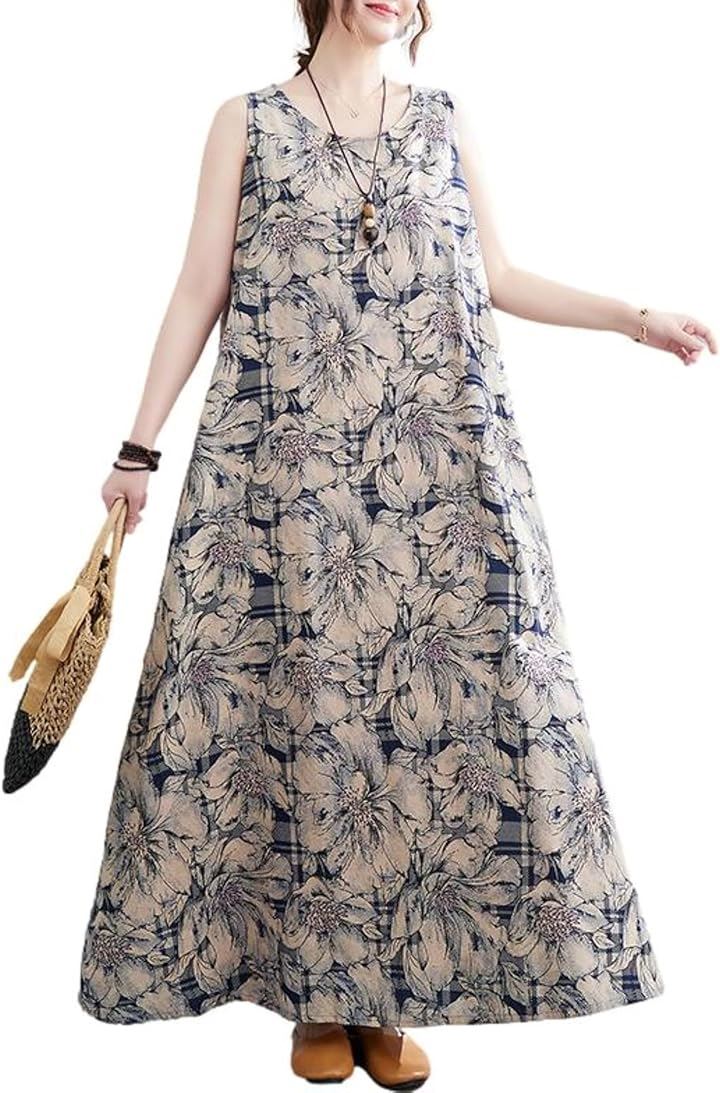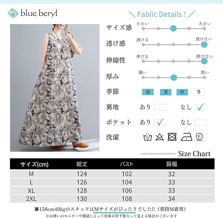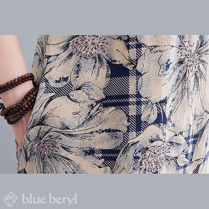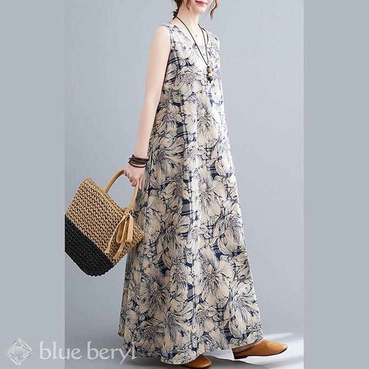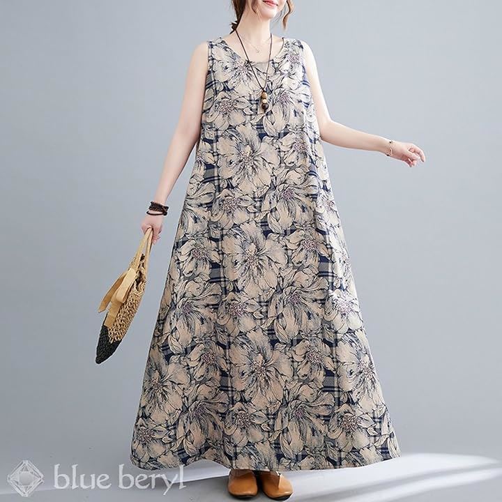 [blue beryl] ワンピース レディース ロング ノースリーブ フラワープリント シック Aライン サマードレス 綿混 ふんわり おしゃれ きちんと感 ヘルシー 裏地なし 高見え オオキイ 大人っぽい 軽い 簡単 軽量 お洒落着 BB042 |