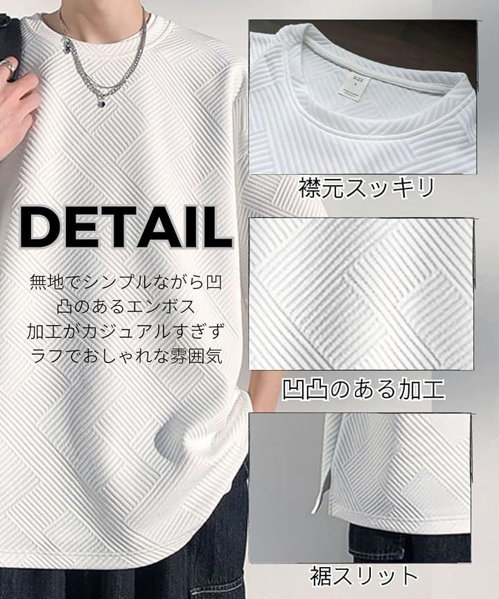 無地でシンプルながら凹凸のあるエンボス加工がカジュアルすぎずラフでおしゃれな雰囲気を醸し出してくれる大人のカットソーになっています