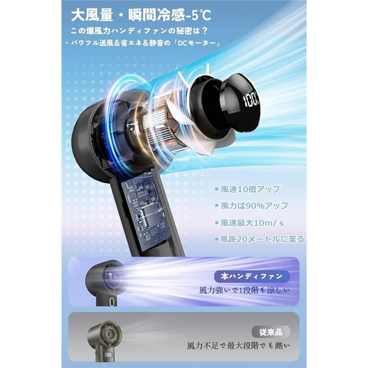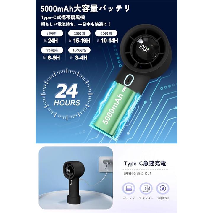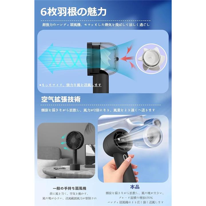 ハンディファン 手持ち扇風機 卓上扇風機 100段階風量・苦手な夏が楽になるBoomax 携帯扇風機 5000mAh 大容量バッテリー 6枚羽根 爆風力・瞬間冷感 最大24時間動作 20dB静音 角度調整 DCモーター type-C USB充電式