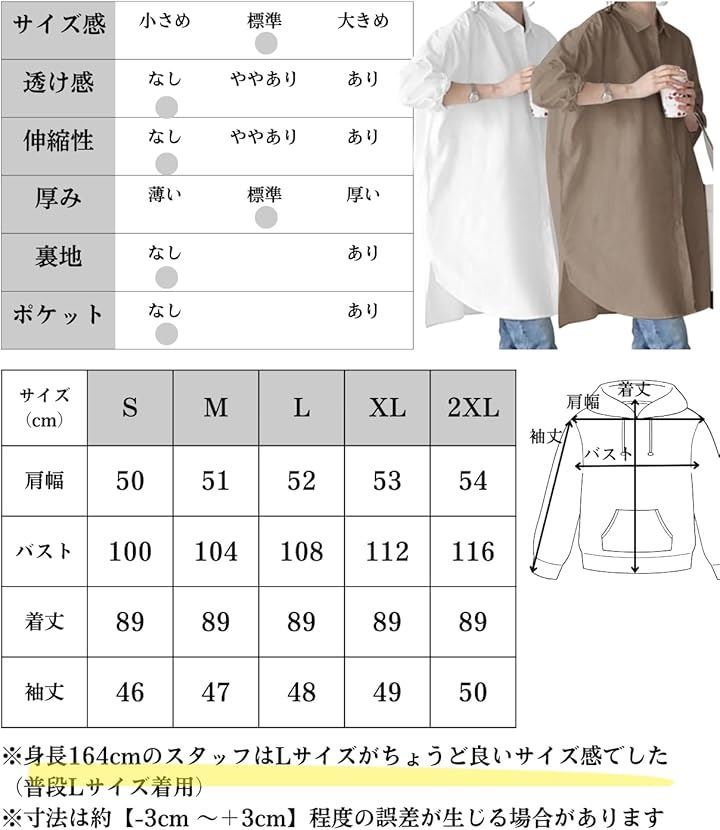 Sサイズ:肩幅 約50cm/バスト 約100cm//着丈 約89cm/袖丈 約46 cm Mサイズ:肩幅 約51cm/バスト 約104cm//着丈 約89cm/袖丈 約47cm Lサイズ:肩幅 約52cm/バスト 約108cm//着丈 約89cm/袖丈 約48cm XLサイズ:肩幅 約53cm/バスト 約112cm//着丈 約89cm/袖丈 約49cm 2XLサイズ:肩幅 約54cm/バスト 約116cm//着丈 約89cm/袖丈 約50cm。