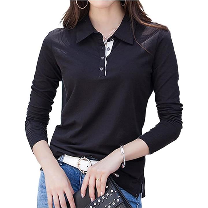 [three Joy] [スリージョイ] レディース ポロシャツ オフィスカジュアル トップス 長袖 ボタン Vネック バイカラー お洒落 かわいい 大人 スポーツ 綿 L ブラック |