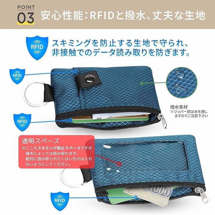 非接触でデータを読み取るRFIDをブロックする生地を使用しているため、不正に読み取られることはありません。