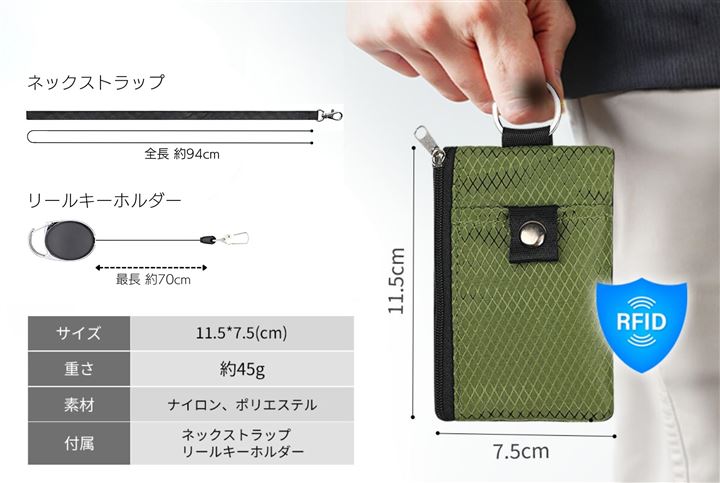 「パッケージ内容」本体、ネックストラップ(長さ約94cm)、リールキーホルダー(最長約70cm)、スキミング防止カードケース