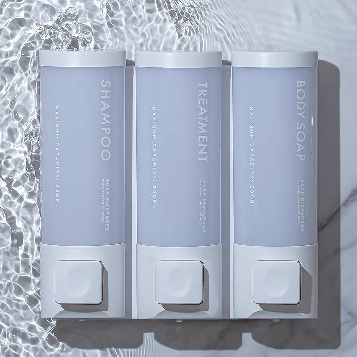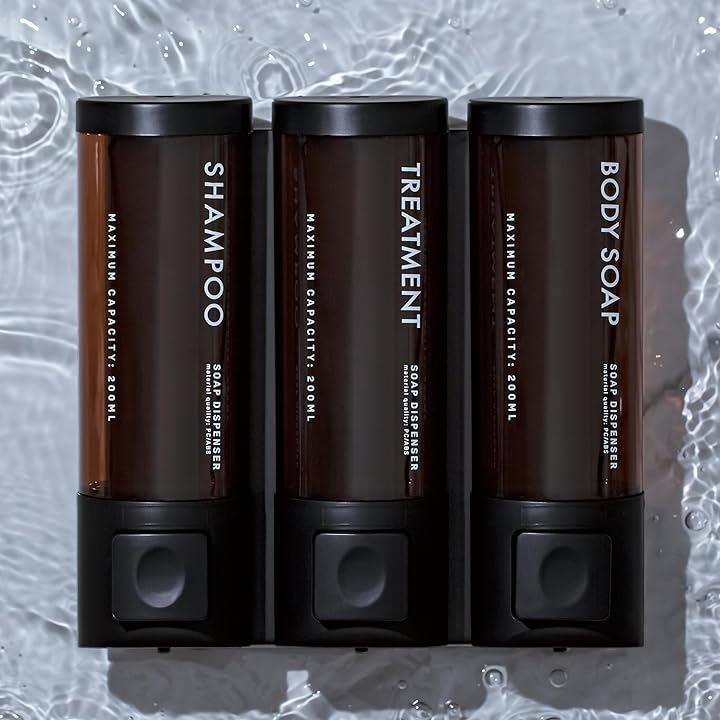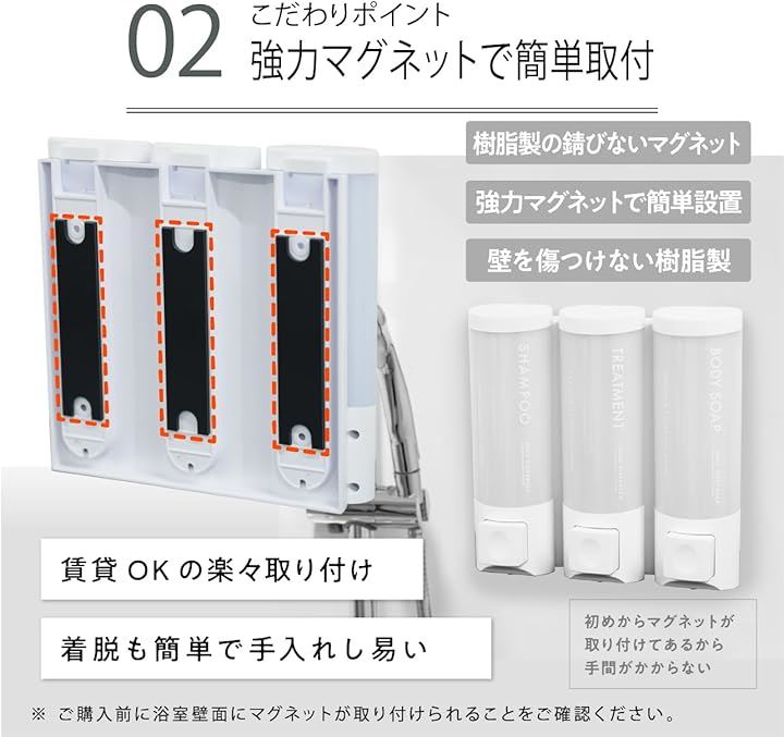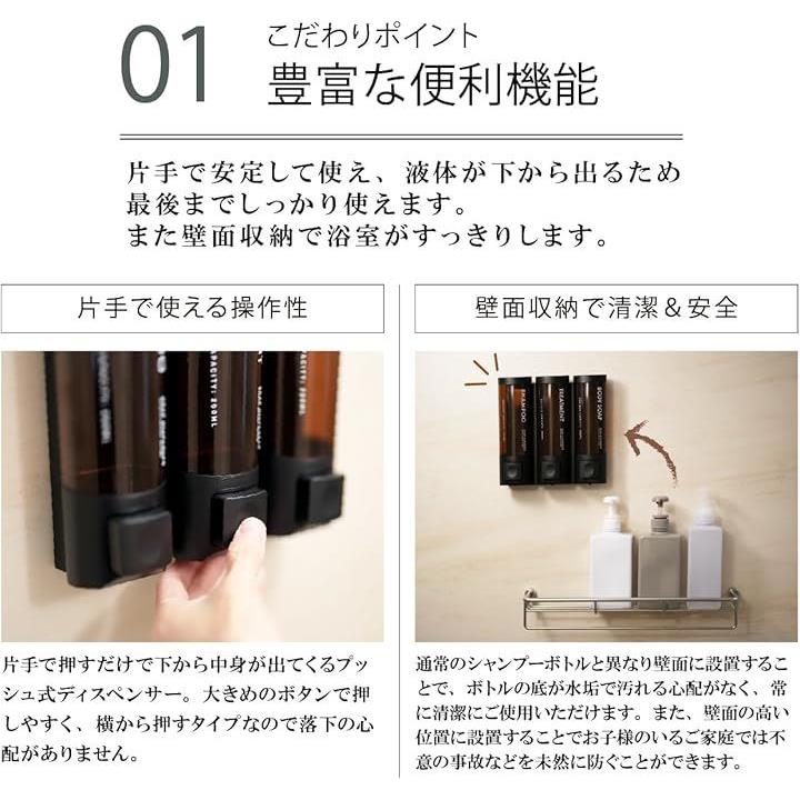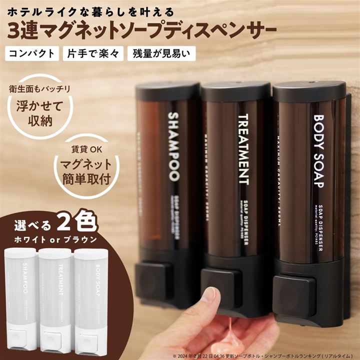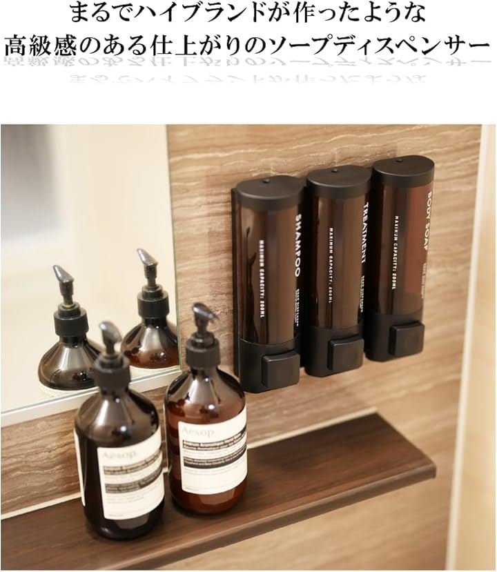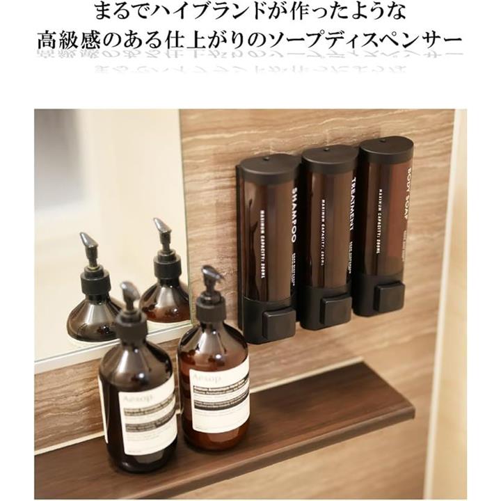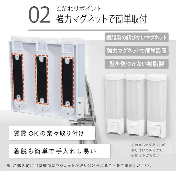 ソープディスペンサー シャンプーディスペンサー 壁掛け 磁石 マグネット 吊り下げ 3本 詰め替え 賃貸OK コンパクト ホテルライク モダン そのまま