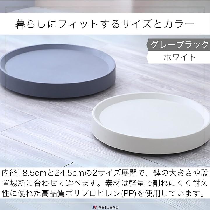 「選べる2サイズ・2カラー」鉢のサイズや設置場所に合わせて選べる2サイズ(外径22.5cm、内径18.5cm、高さ4.8cm/外径28.5cm、内径24.5cm、高さ5.4cm)を展開。