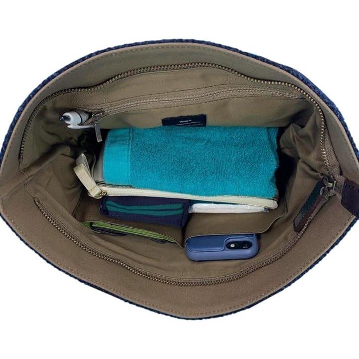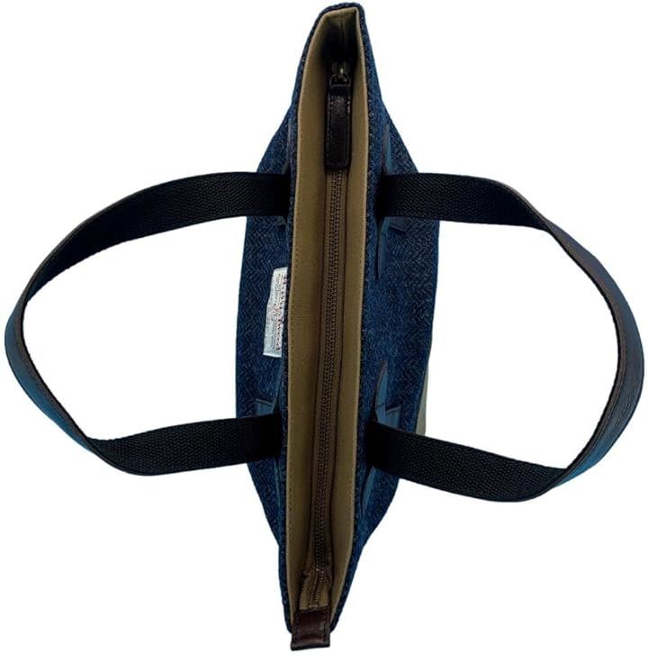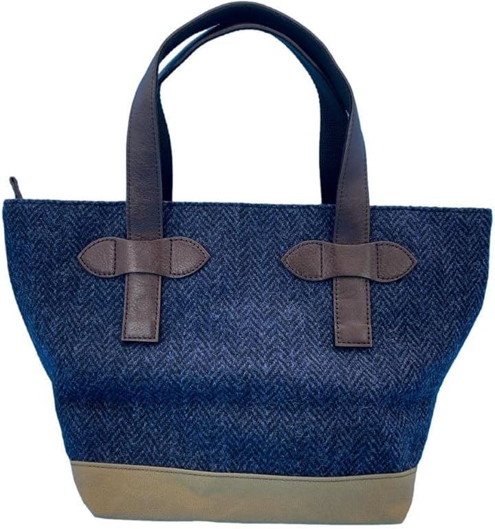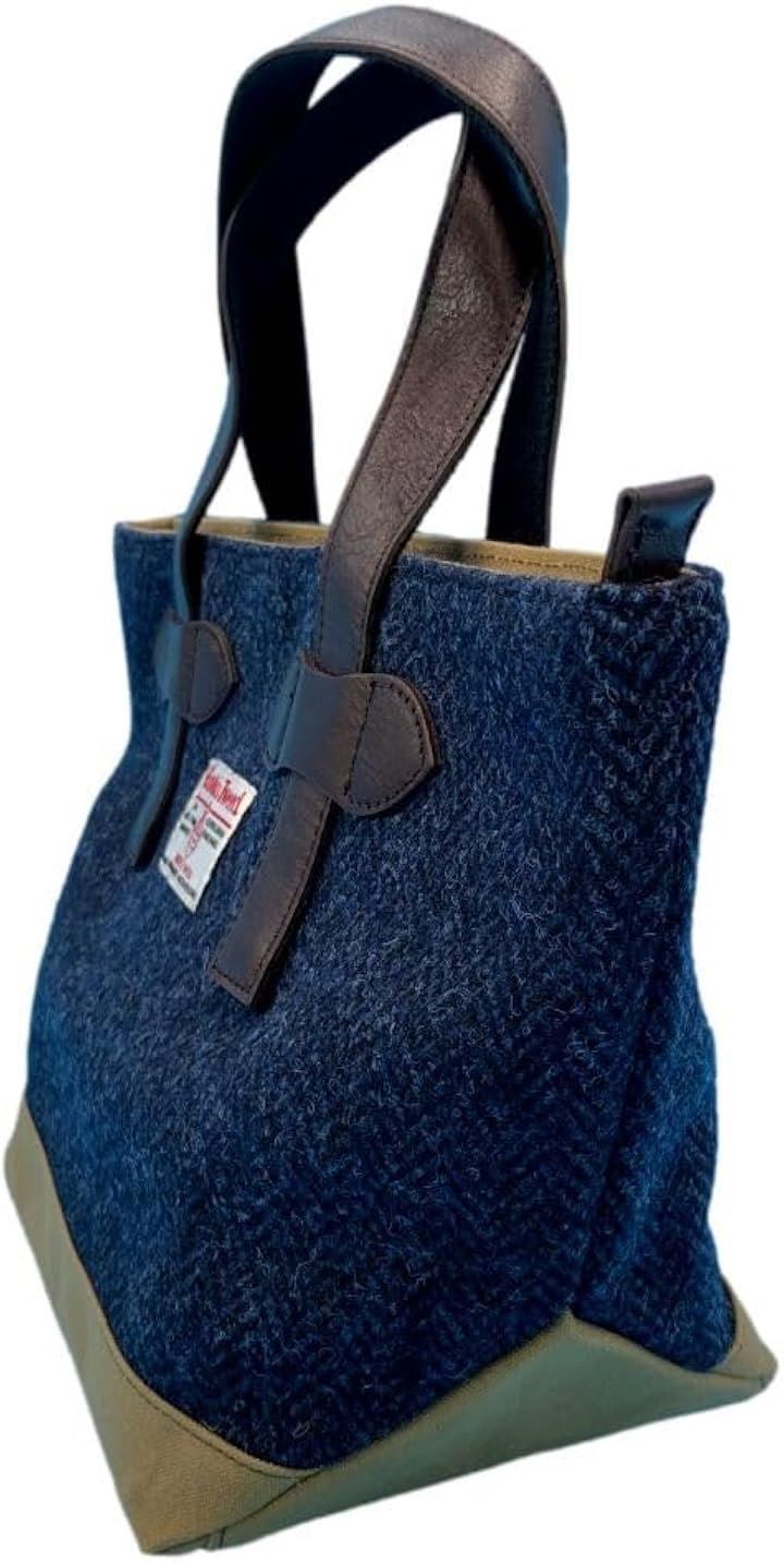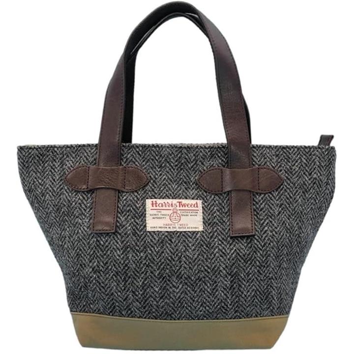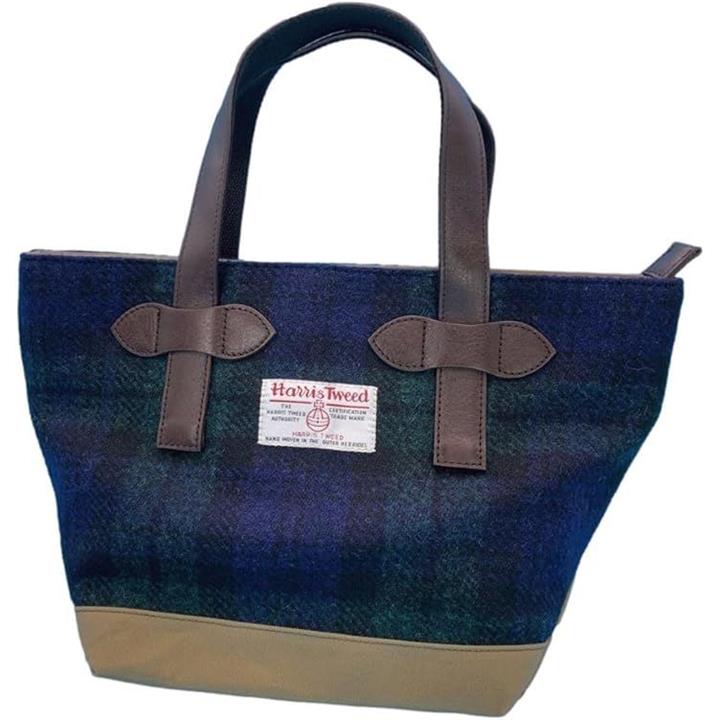 Harris Tweed ハリスツイードxパラフィン帆布の横型手提げトート、牛革付属、天ファスナー付き