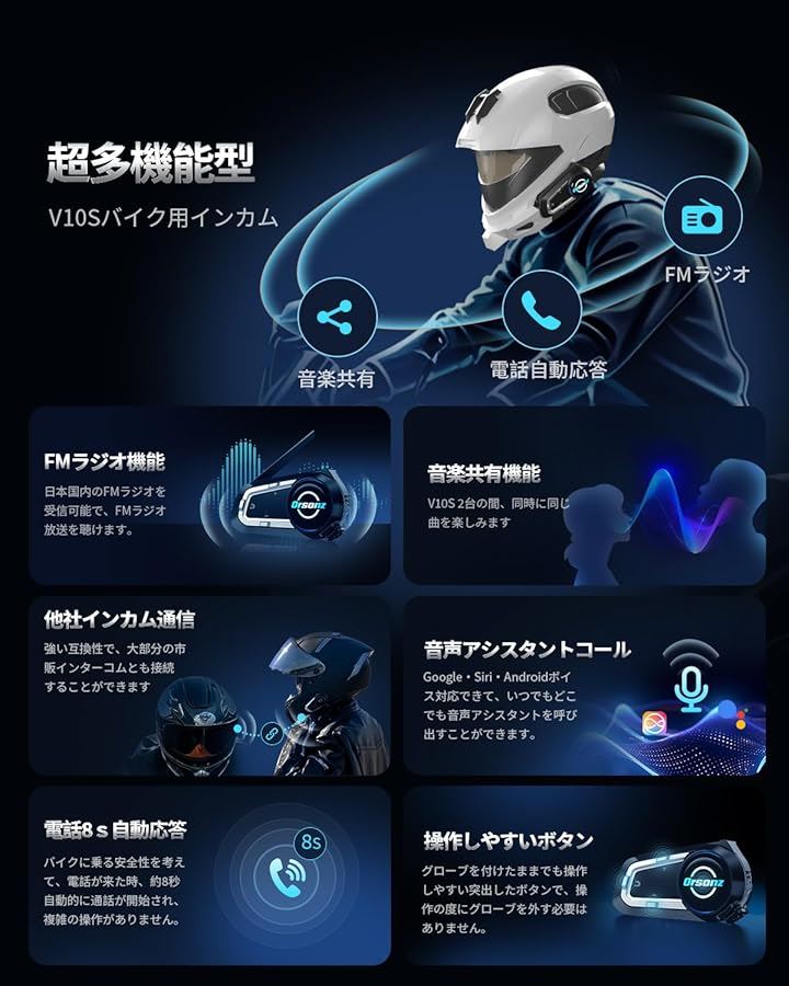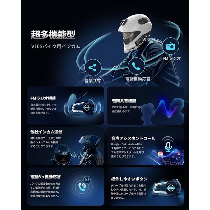 「互換品」Orsonz バイク インカム V10Sバイク用インカム Bluetooth5.3 10人同時通話 通信距離2000m 連続使用24時間 通信自動復帰 日本語音声案内 バイク用通信機器 IP67防水防塵 ENC&DSP&CVCノイズキャンセル HIFI音質 |