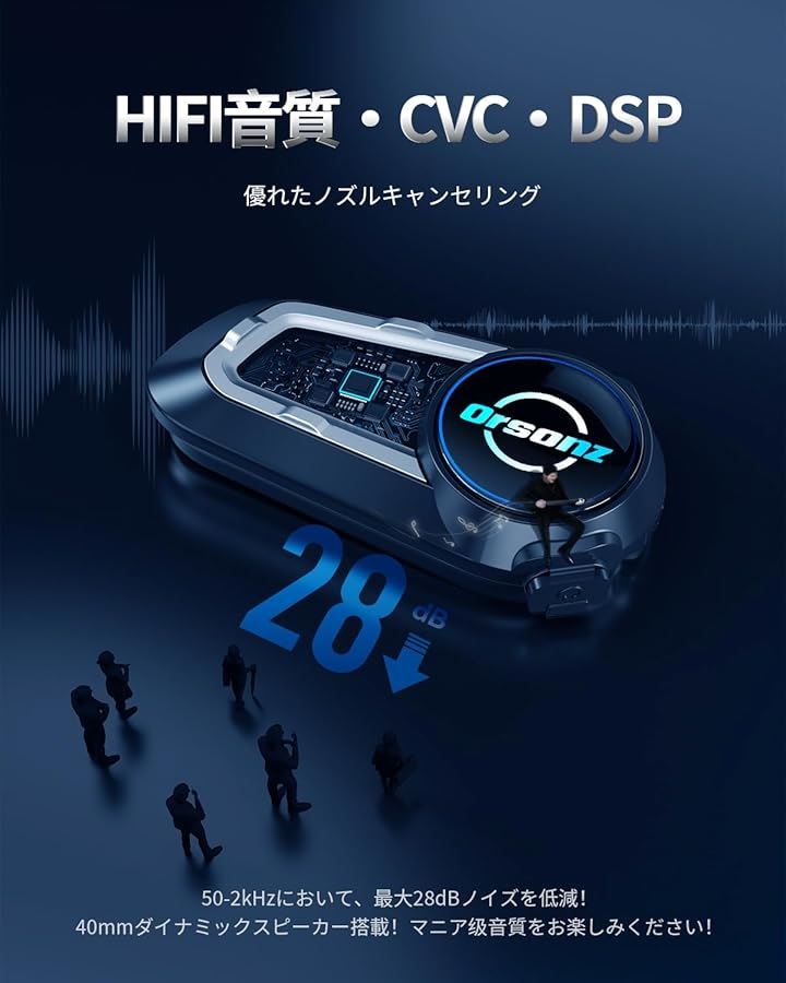 「CVC ノイズ低減技術とHiFi 音質」バイクインカムはCVC ノイズ低減機能を搭載し、内蔵マイクとアルゴリズムを通じて、収集した音声を識別し処理します。