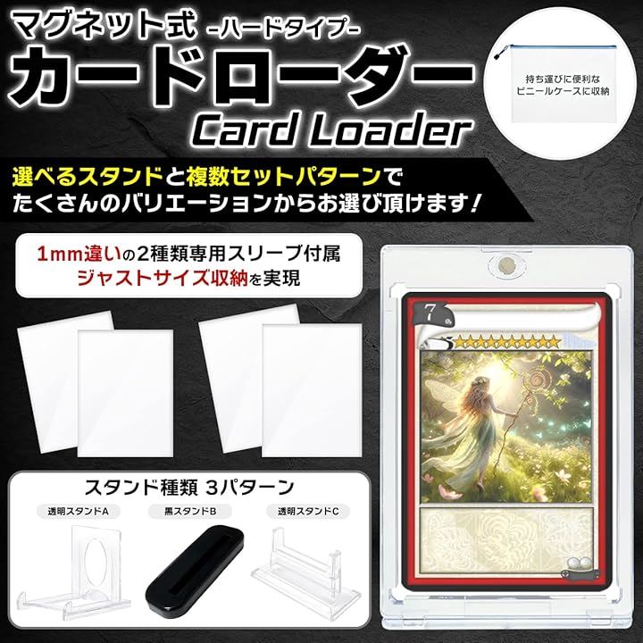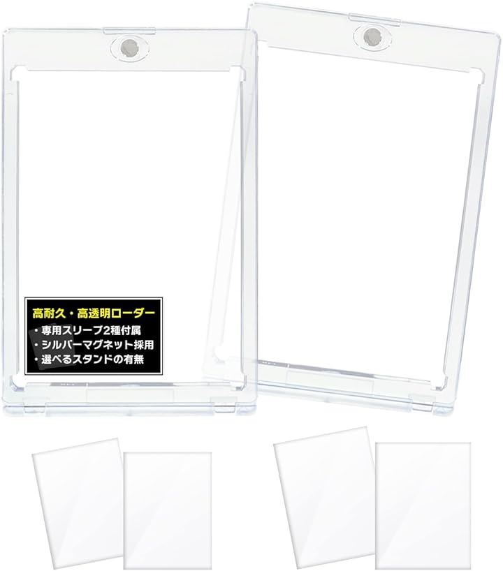 「大人気のマグネットローダー、2種の専用スリーブ付属でジャストサイズ収納を実現」レギュラーサイズ用のマグネット式のカードローダー、大切なカードを傷や汚れ・折れや色褪せから守り、長期間美しい状態で保ちます。
