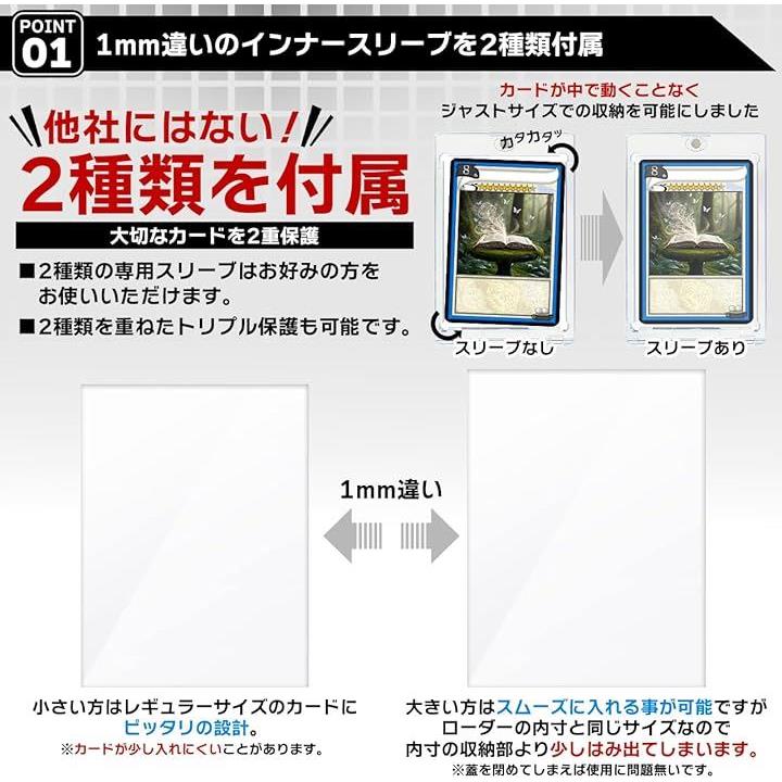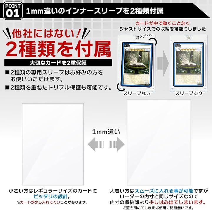 1mm違いのインナースリーブ2種類付属で大切なカードを2重保護、カードが中で動くことなくジャストサイズでの収納を可能にしました(スリーブを使用した場合。