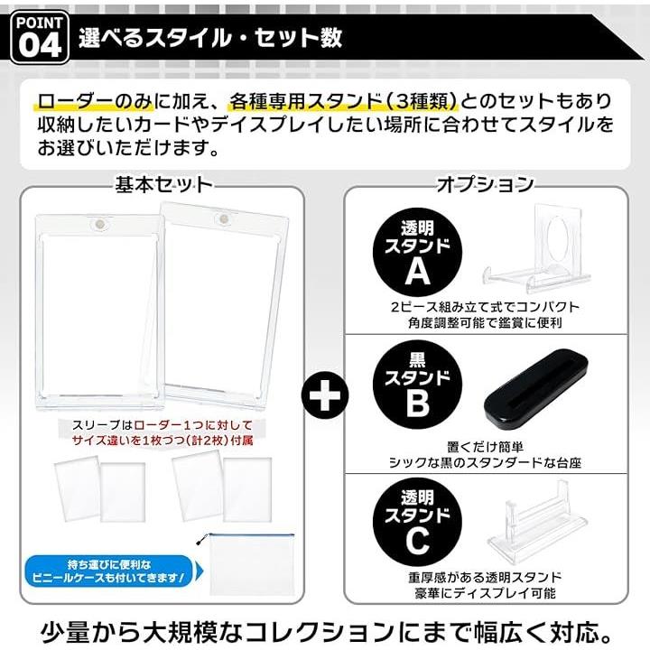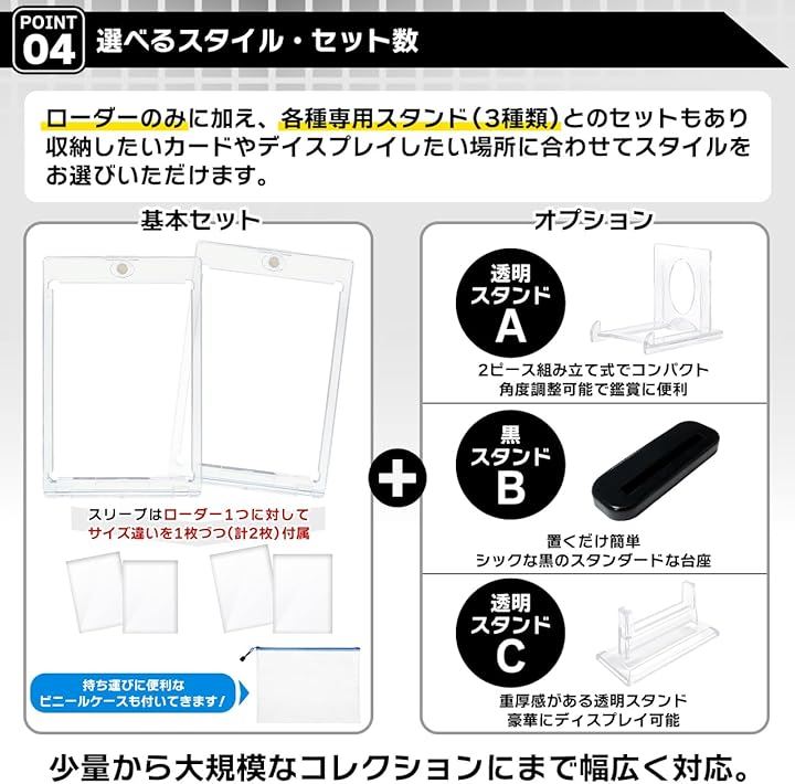 「選べるスタイル・セット数」ローダーのみに加え、各種専用スタンド(3種類)とのセットもあり、収納したいカードやデイスプレイしたい場所に合わせてスタイルをお選びいただけます。
