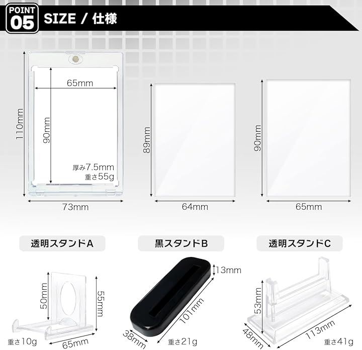 スタイル:ローダーのみ ・セット数:4セット ・セット内容:ホルダー4個、専用スリーブ2種4枚ずつ合計8枚 ・ホルダー:外寸73x110mm、内寸65x90mm(カード収納部)、厚み7.5mm、重さ55g ・スリーブ寸法:64x89mmと65x90mm
