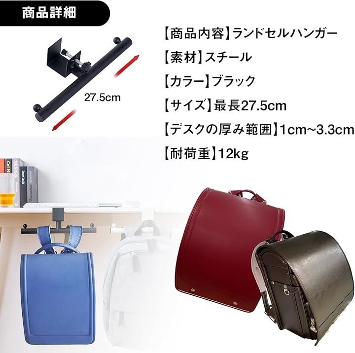 デスク用 ランドセル掛け ハンガー リュック 水筒 傘掛け ぶら下げ 小学生 便利雑貨 スチール製 安定感