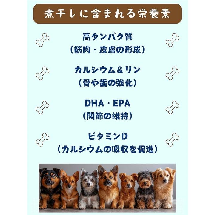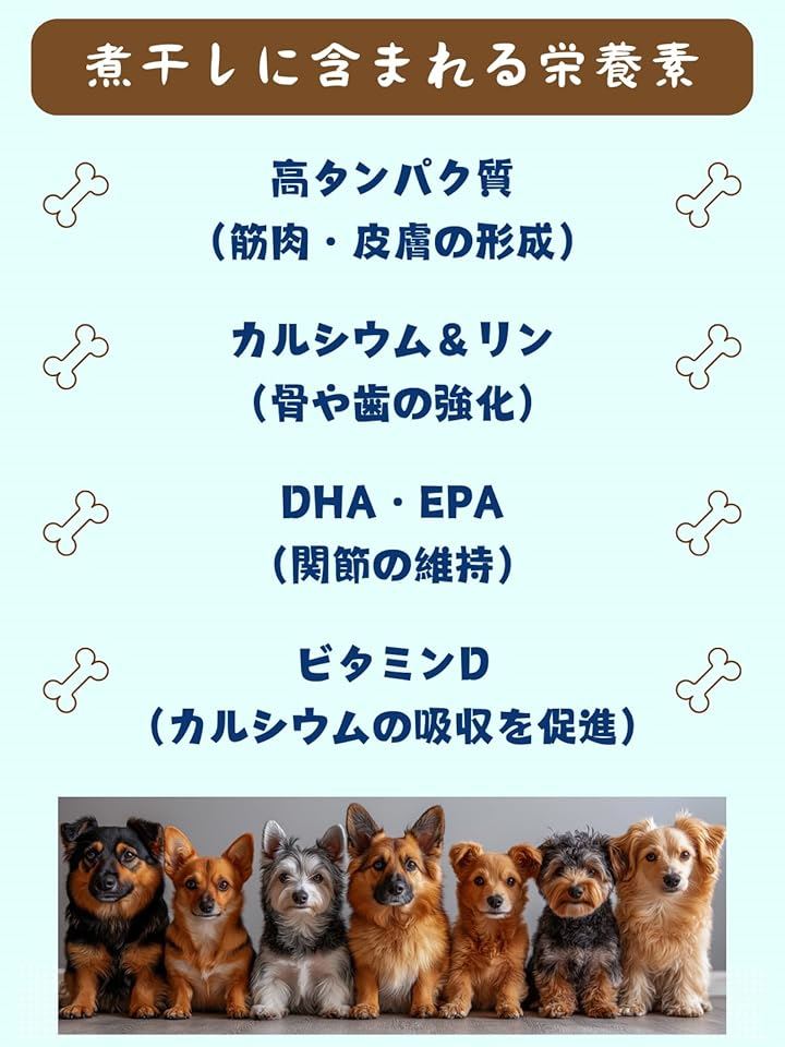 「ペットの健康をサポートする栄養素がたっぷり。」 煮干しには、ペットの健康維持に欠かせない栄養素が豊富に含まれています。