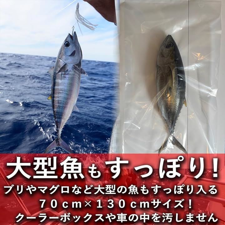 2. そんな釣り人の悩みを解決するのが、「極厚ロングポリ袋(70cmx130cm)」です。この大型ビニール袋は、釣った魚をスムーズに収納できるように設計されており、ブリやマグロなどの大型魚もすっぽり入る特大サイズ。