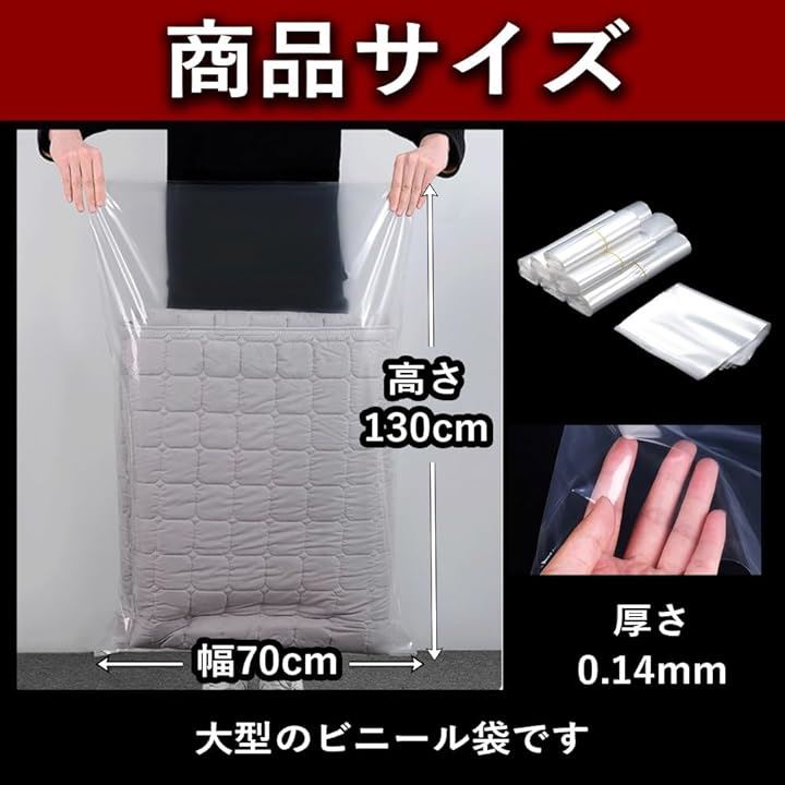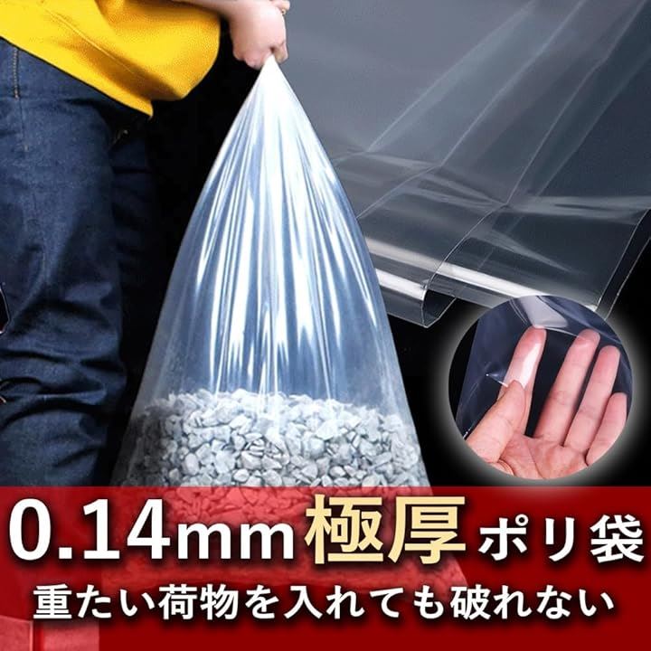 さらに、厚さ0.14mmの極厚素材を採用しており、一般的なポリ袋に比べて格段に破れにくくなっています。