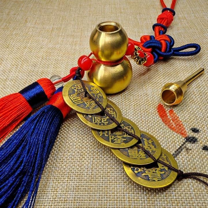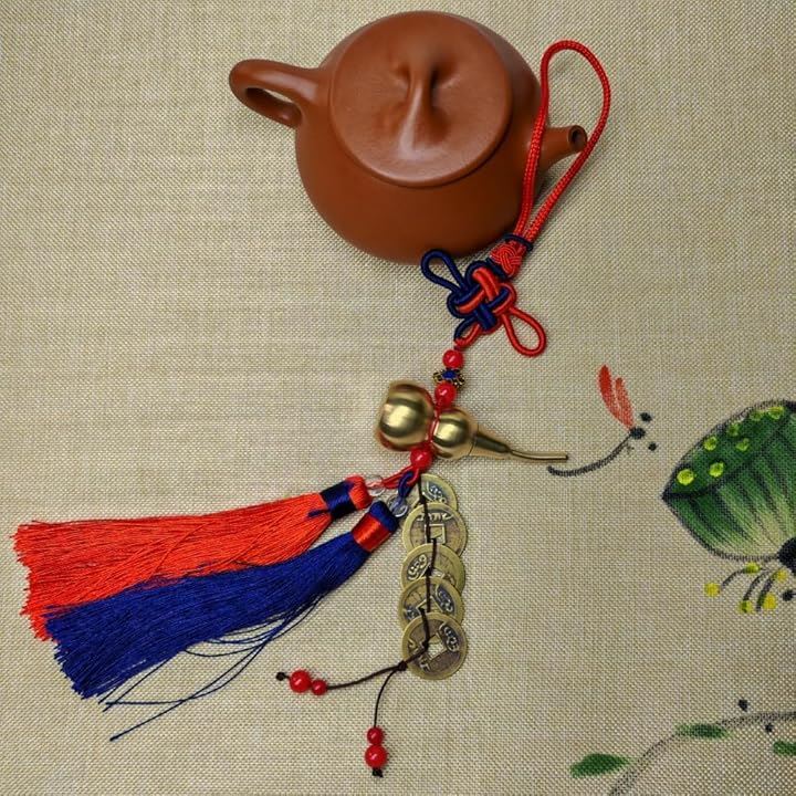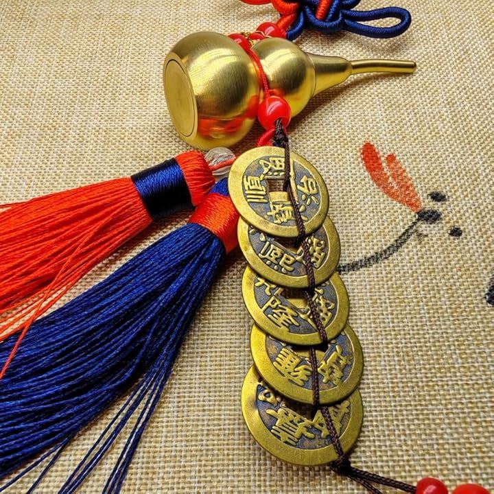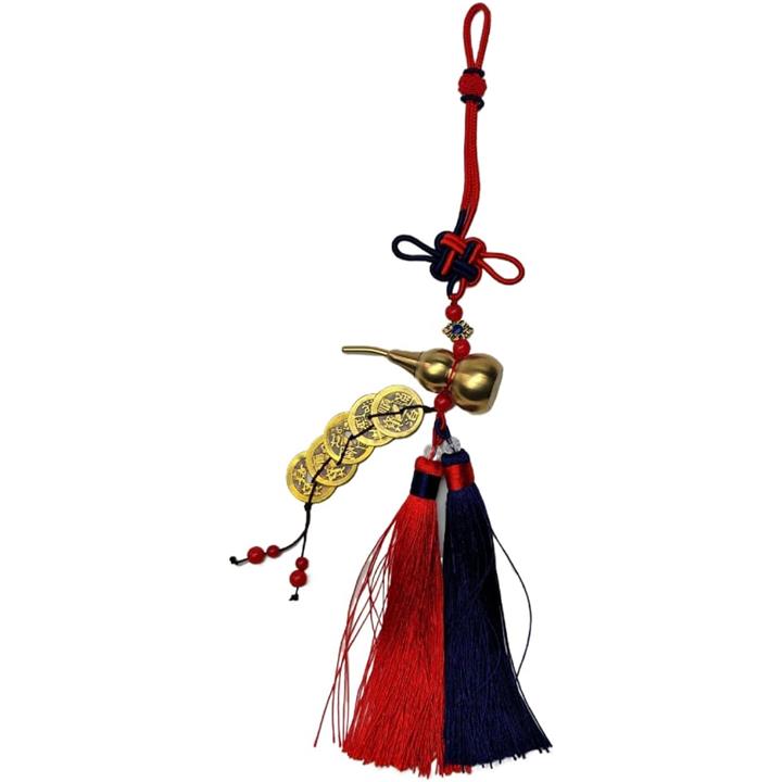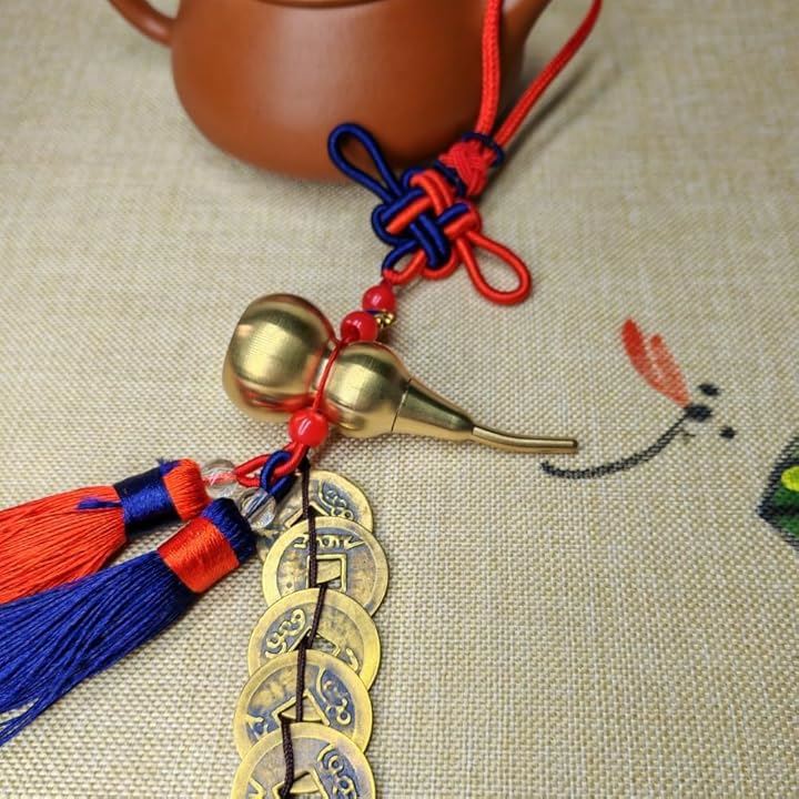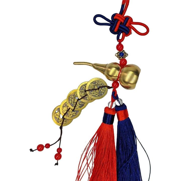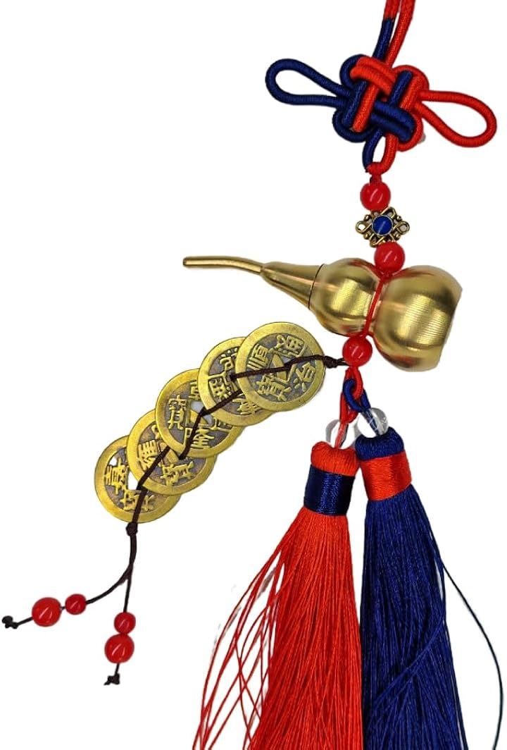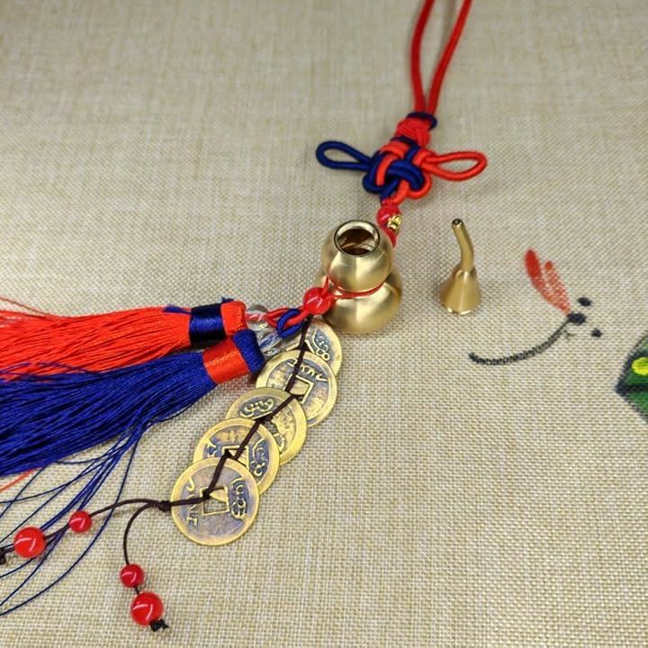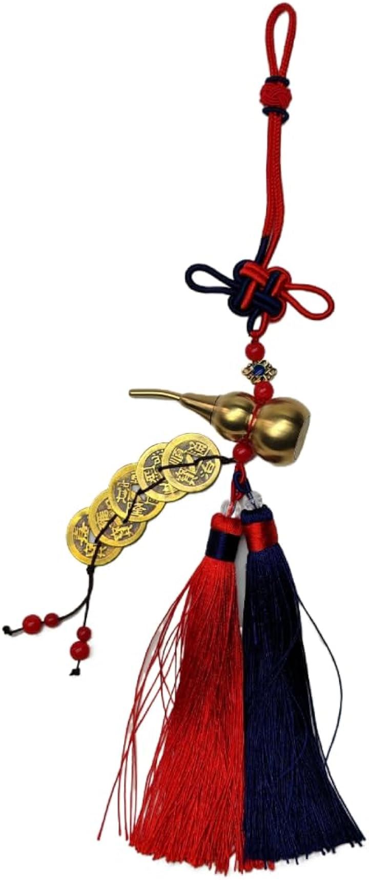 赤い房付き五銭銅貨と銅製ひょうたん 縁結び装飾 手編みストラップ 縁起物の壁掛け 金運 風水グッズ