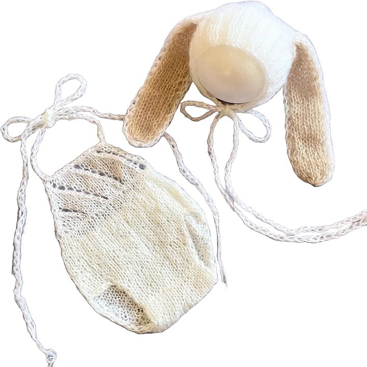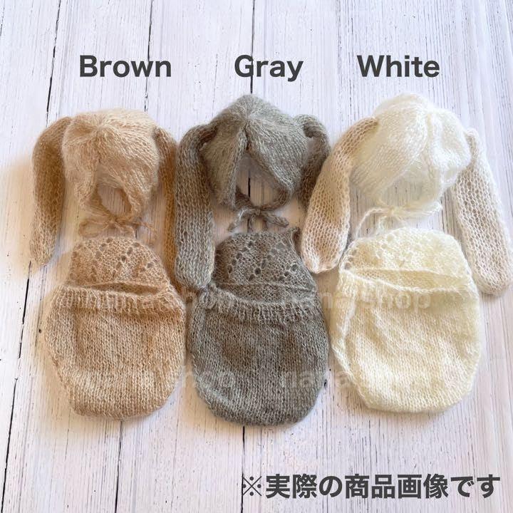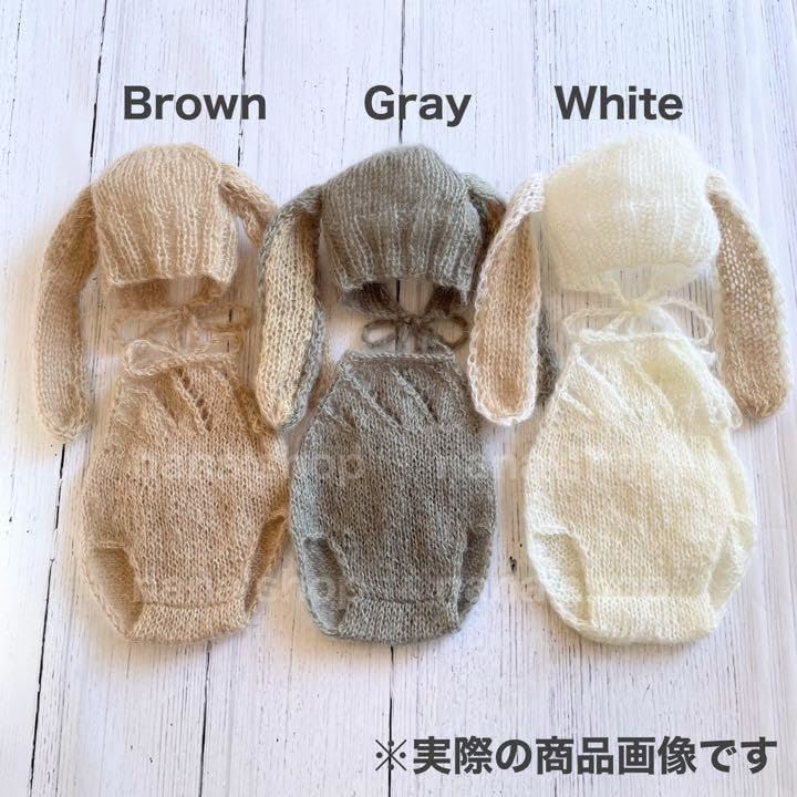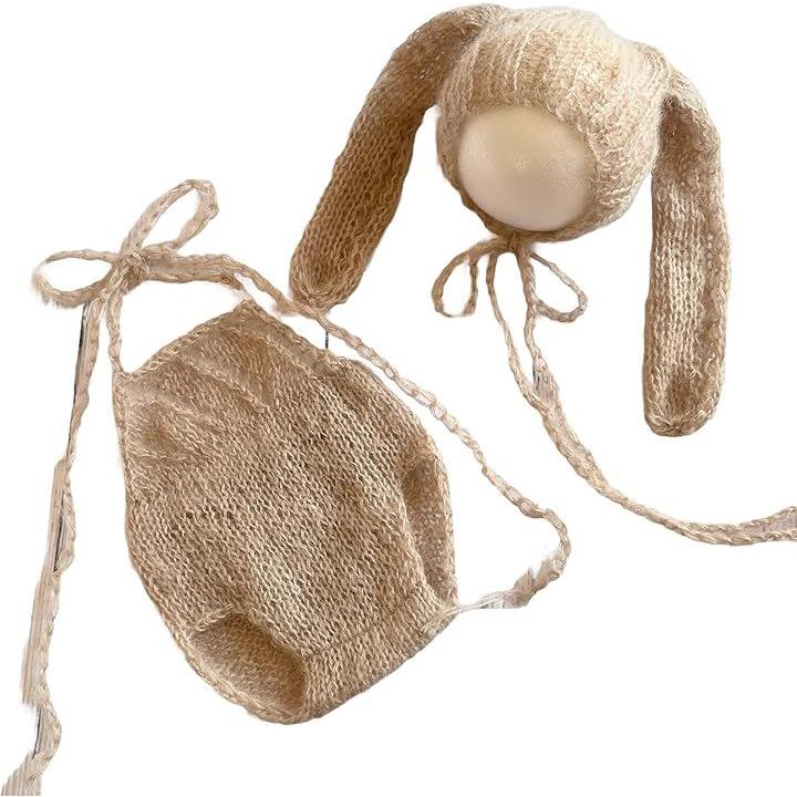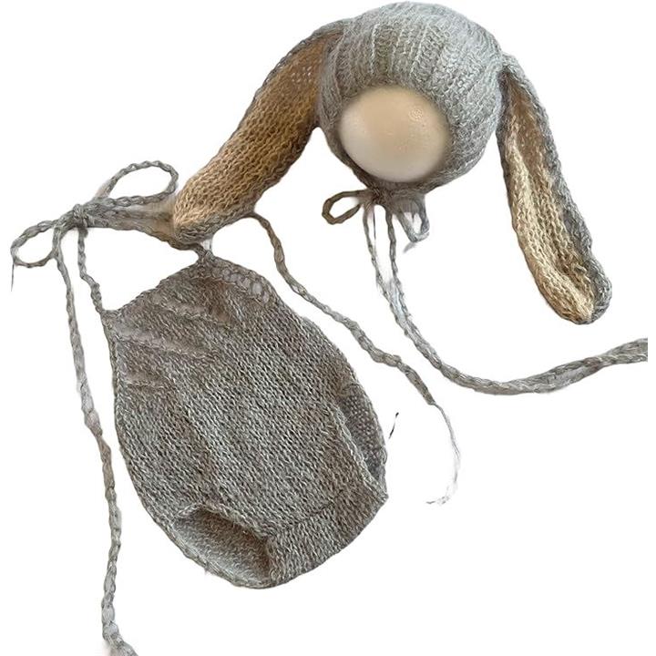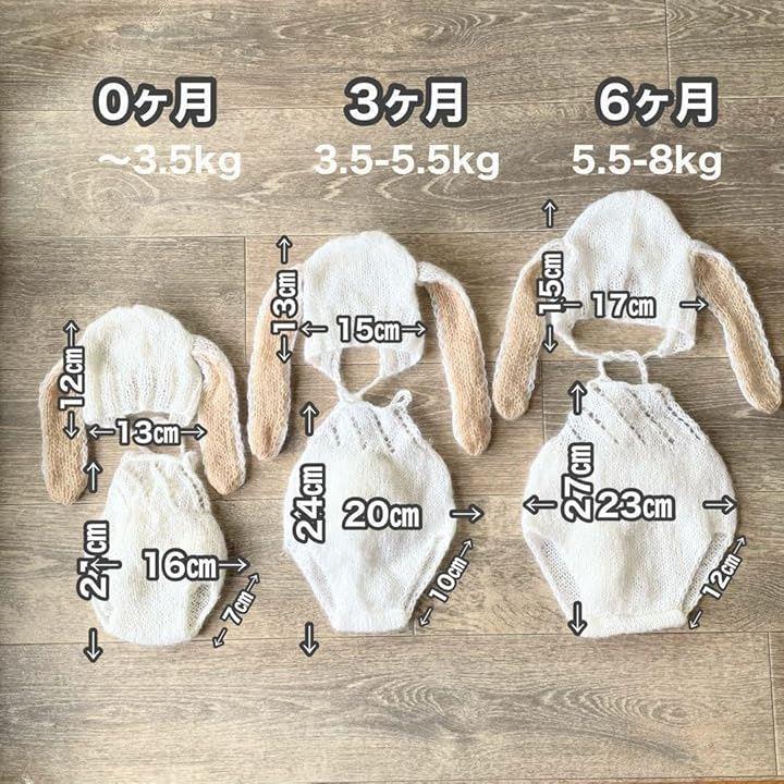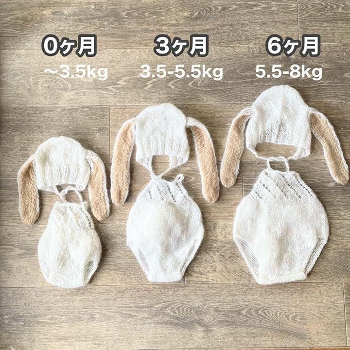 うさぎ耳帽子と編み模様オーバーオール ニューボーンフォト衣装 ボンネット 月齢フォト