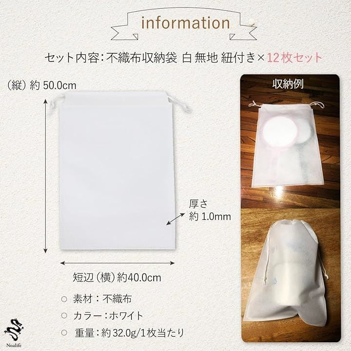「商品仕様」セット内容:不織布収納袋 巾着袋 白 無地 紐付きx12枚セット サイズ(外寸):長辺(縦) 約50.0cm , 短辺(横) 約40.0cm 厚さ 約1.0mm 重量:約32.0g/1枚当たり 素材:不織布 カラー:ホワイト *モニターの環境等により、色の見え方に若干差が生じる場合がございます。