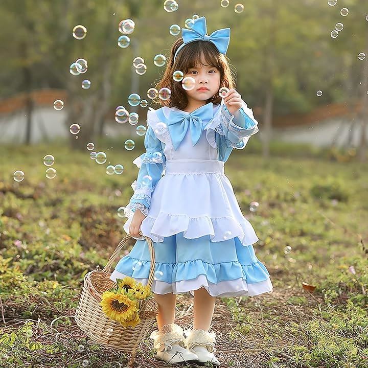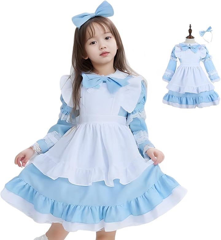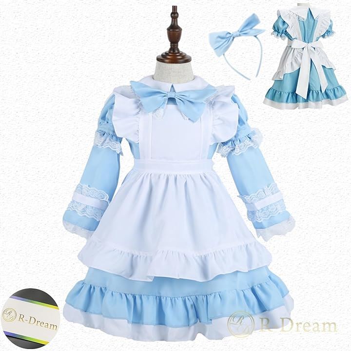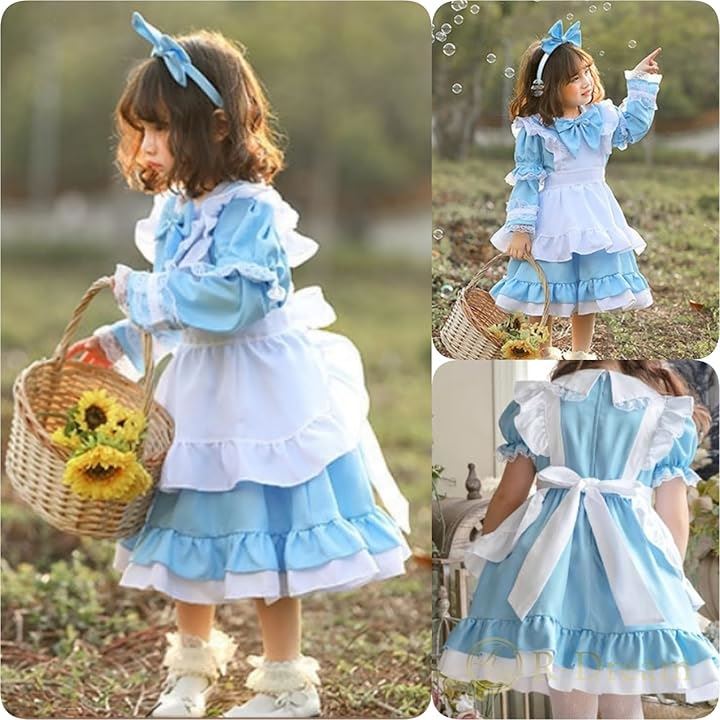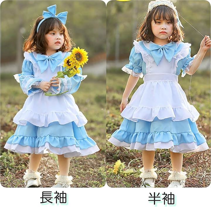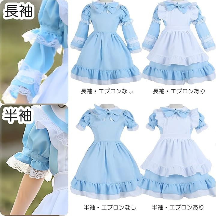 コスプレ 子供 女の子 キッズ 半袖 長袖 調節可 コスチューム 衣装 メイド服 ワンピース ドレス エプロン 可愛い ハロウィン 仮装 イースター 水色