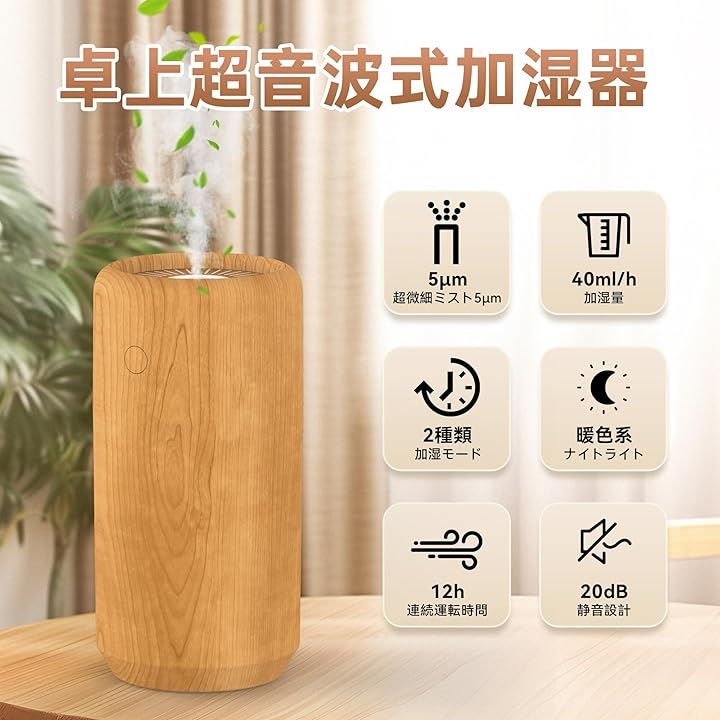 「先進的な超音波技術&超微細5μmナノミスト」この小型加湿器は、先進的な超音波技術を採用し、超微細な5μmナノミストを放出します。