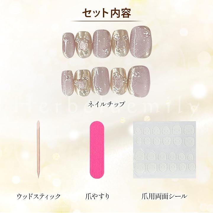 ネイルチップのセットには、両面接着シール、爪ヤスリ、ウッドスティックが付属しており、自宅で簡単に取り付けや取り外しができます。