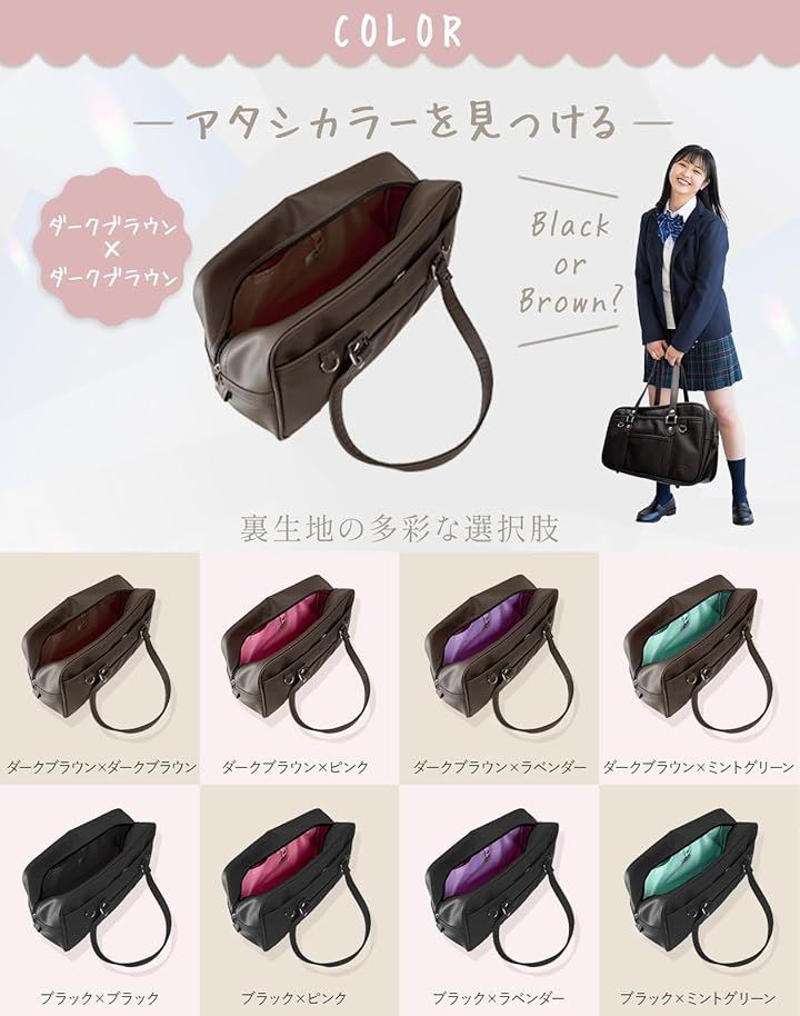 選べるカラーバリエーション:本体はブラック&ダークブラウン、裏地は定番の同色に加えピンク、ラベンダー、ミントグリーンの各4色展開。