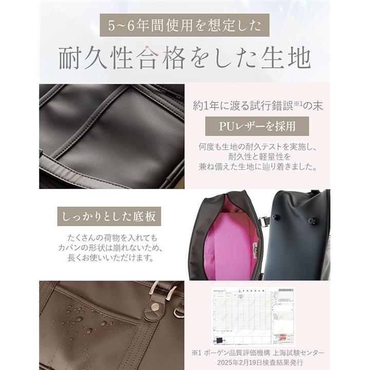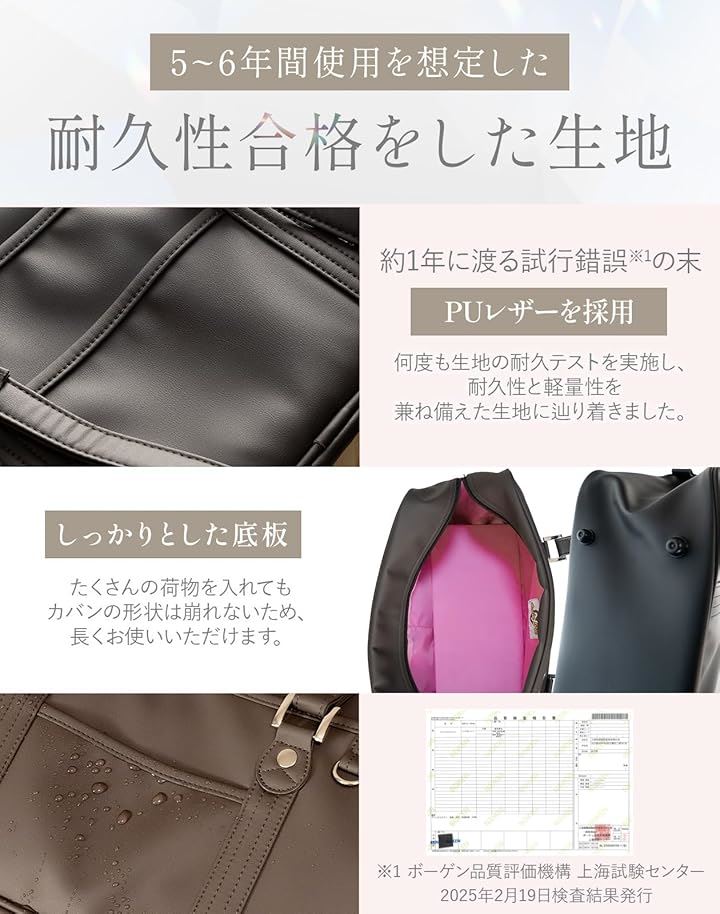 「耐久性抜群。5年の耐久試験クリア」 本スクールバッグは5年間の耐久試験をクリアした確かな品質。