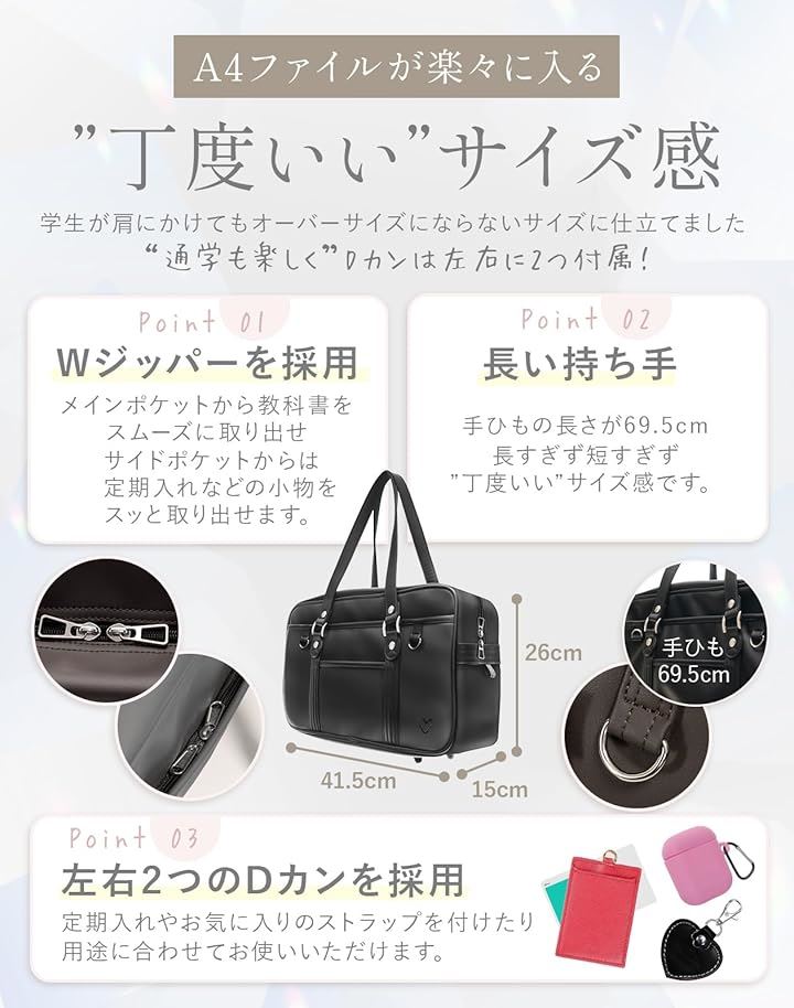 毎日の通学でハードに使っても、型崩れしにくく長く愛用できます。