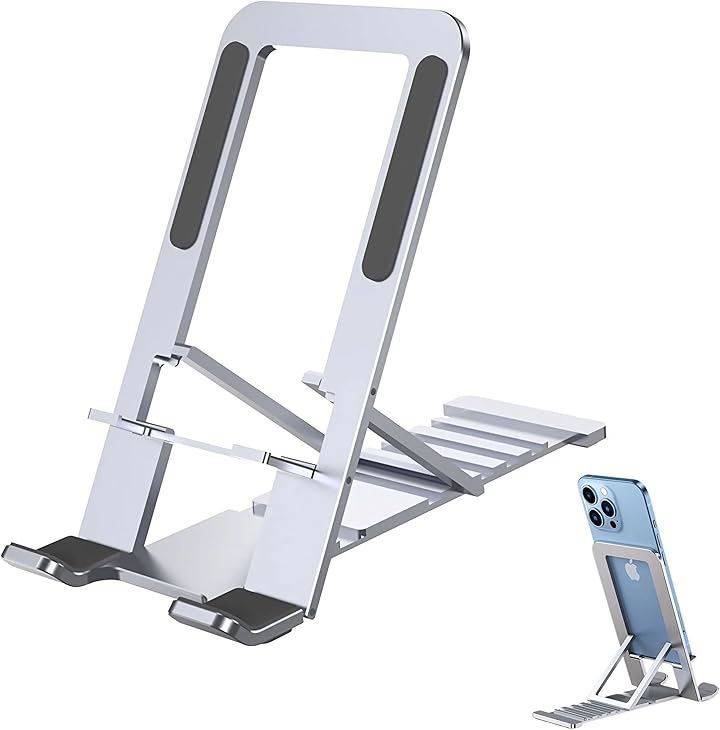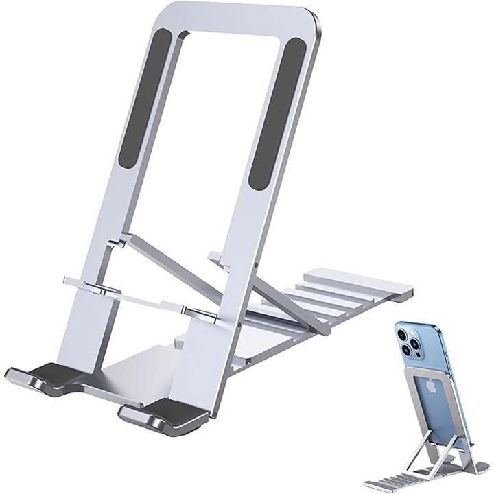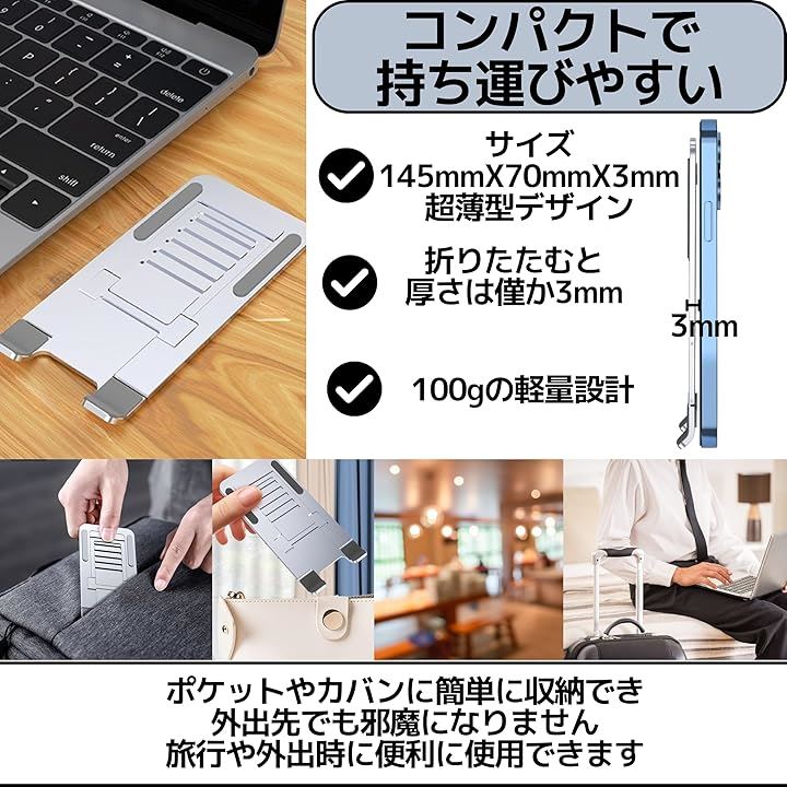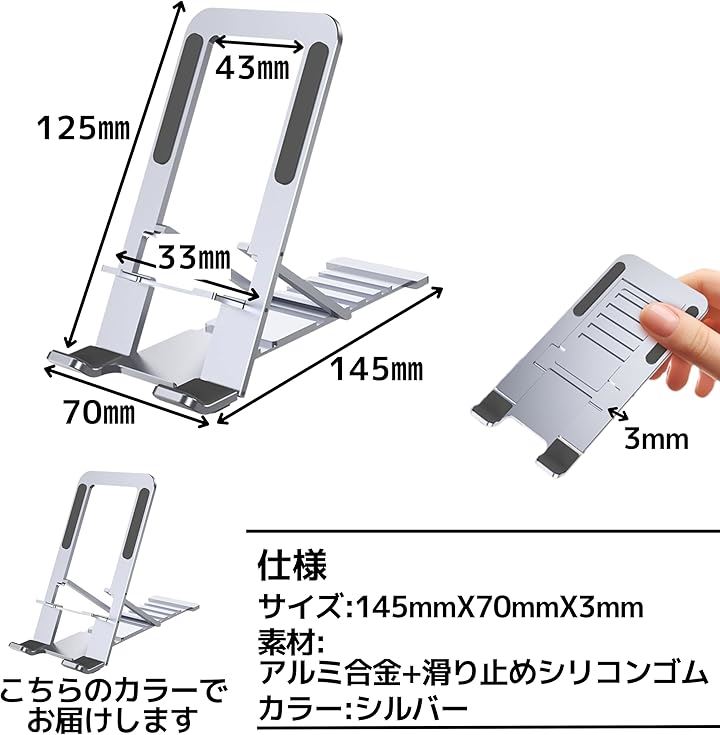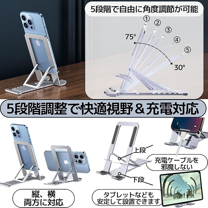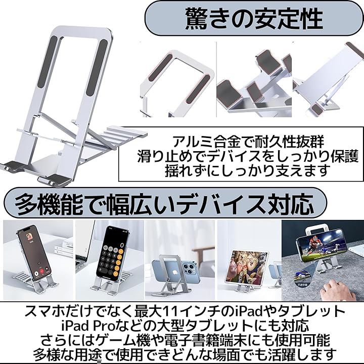 スマホ タブレット スタンド 折り畳み アルミ コンパクト 卓上 持ち運び 軽量 超薄型 シルバー
