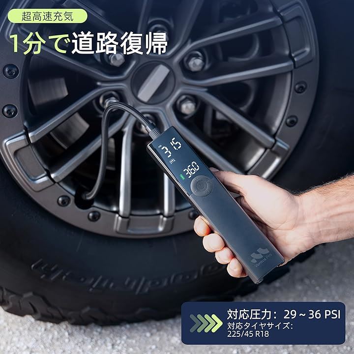 「超高速充填 &自動停止」 Woowind Ventus Pro 空気入れは22L/分の高速充填を実現し、車・オートバイ・SUVのタイヤをたった60秒で充填します。