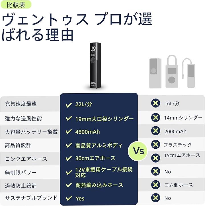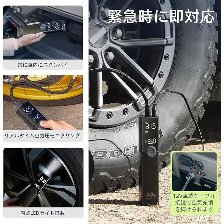 電動 空気入れ コンプレッサー 充電式 DC12V シガーソケット 最大圧力150PSI 空気圧指定可 自動停止 米 英 仏式 バルブ対応 Ventus Pro |