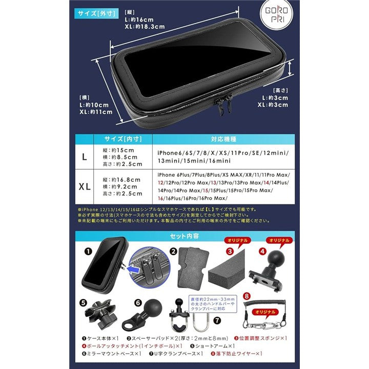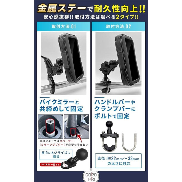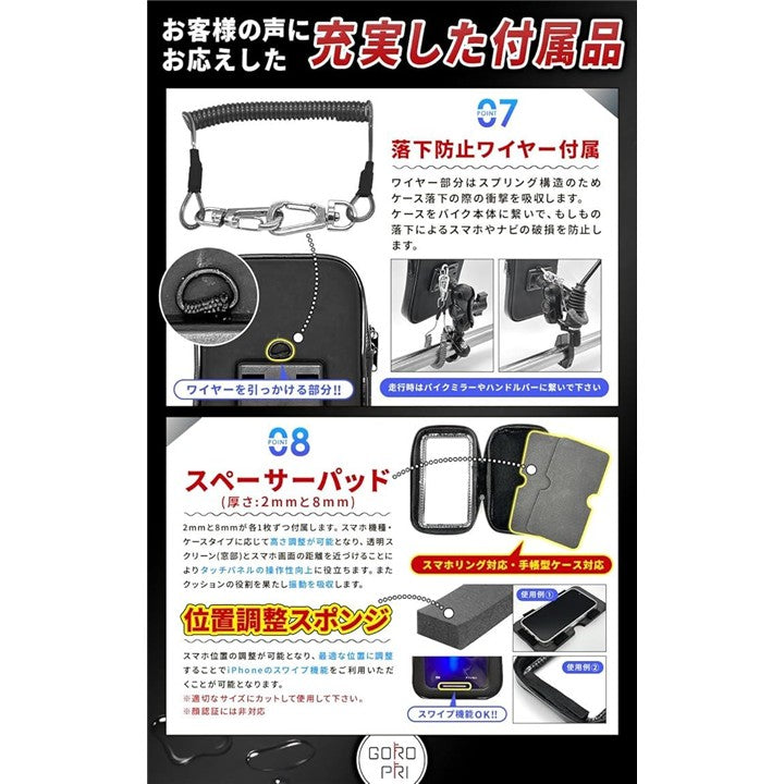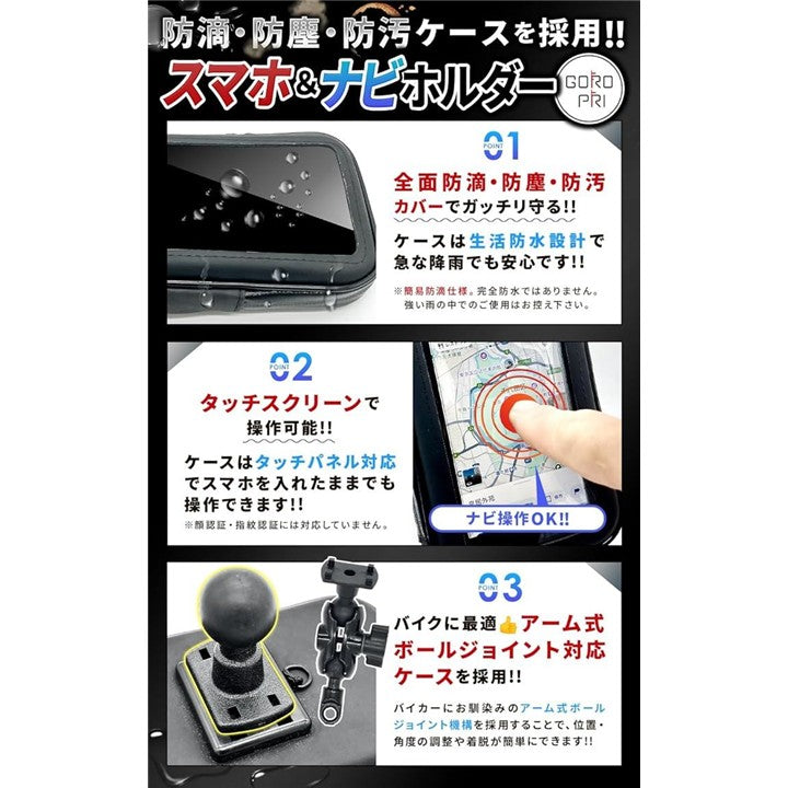 「GOROPRI」 バイク スマホホルダー 防水 防塵 防汚 原付対応 角度調整自由自在 360度回転 タッチパネル対応 カード収納 位置調整可能 脱落防止ワイヤー付属 ラム マウント互換品 (ブラック(セット), L) |